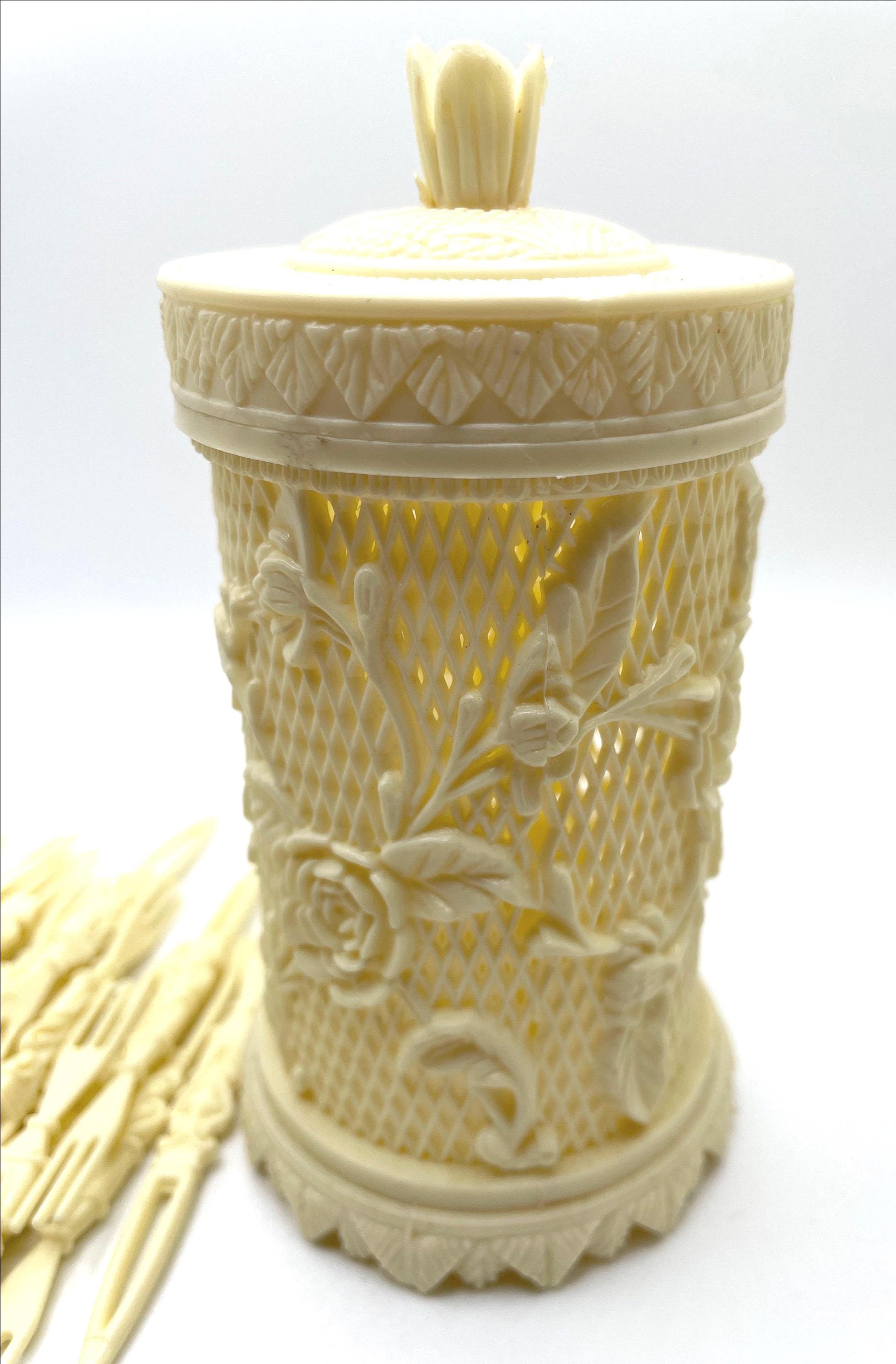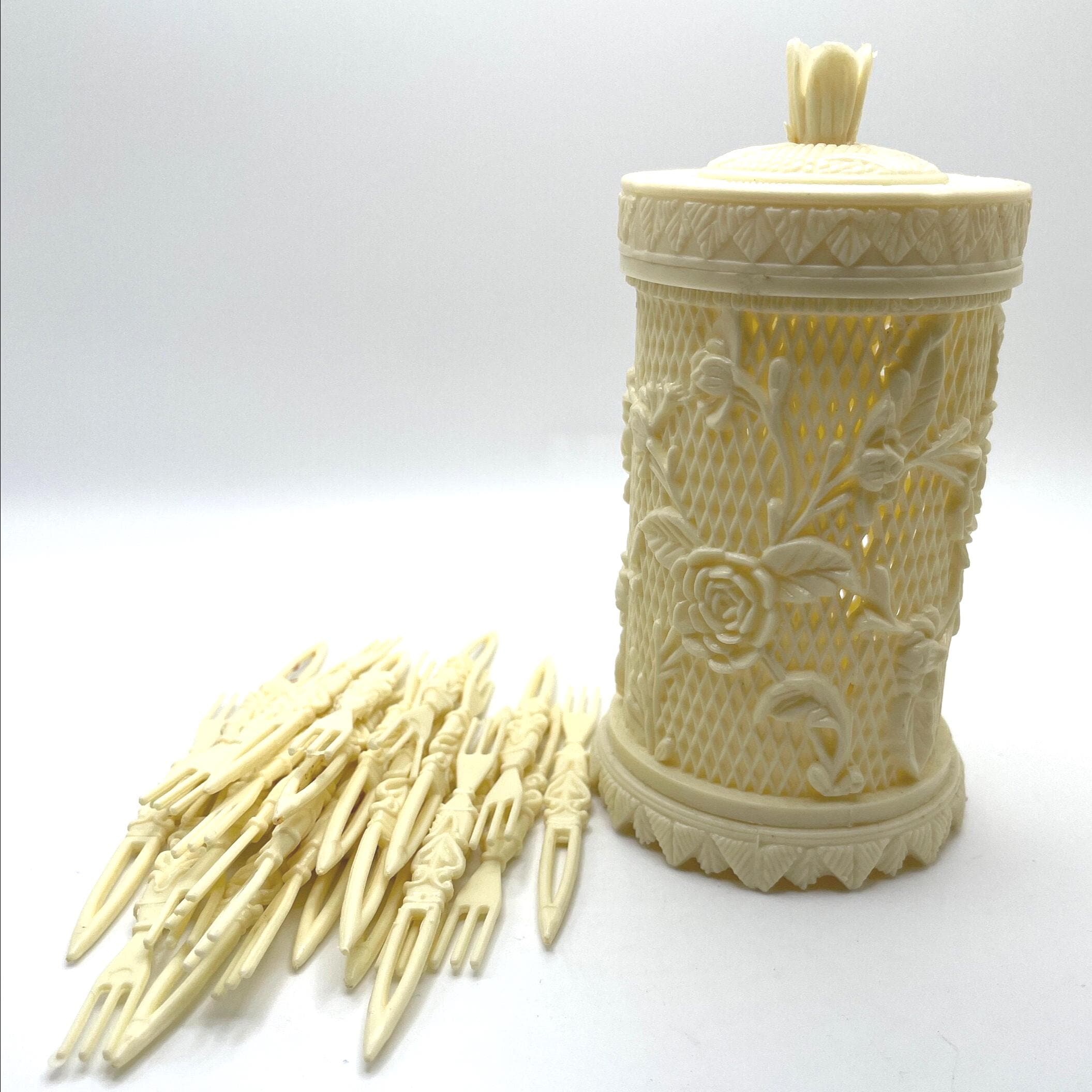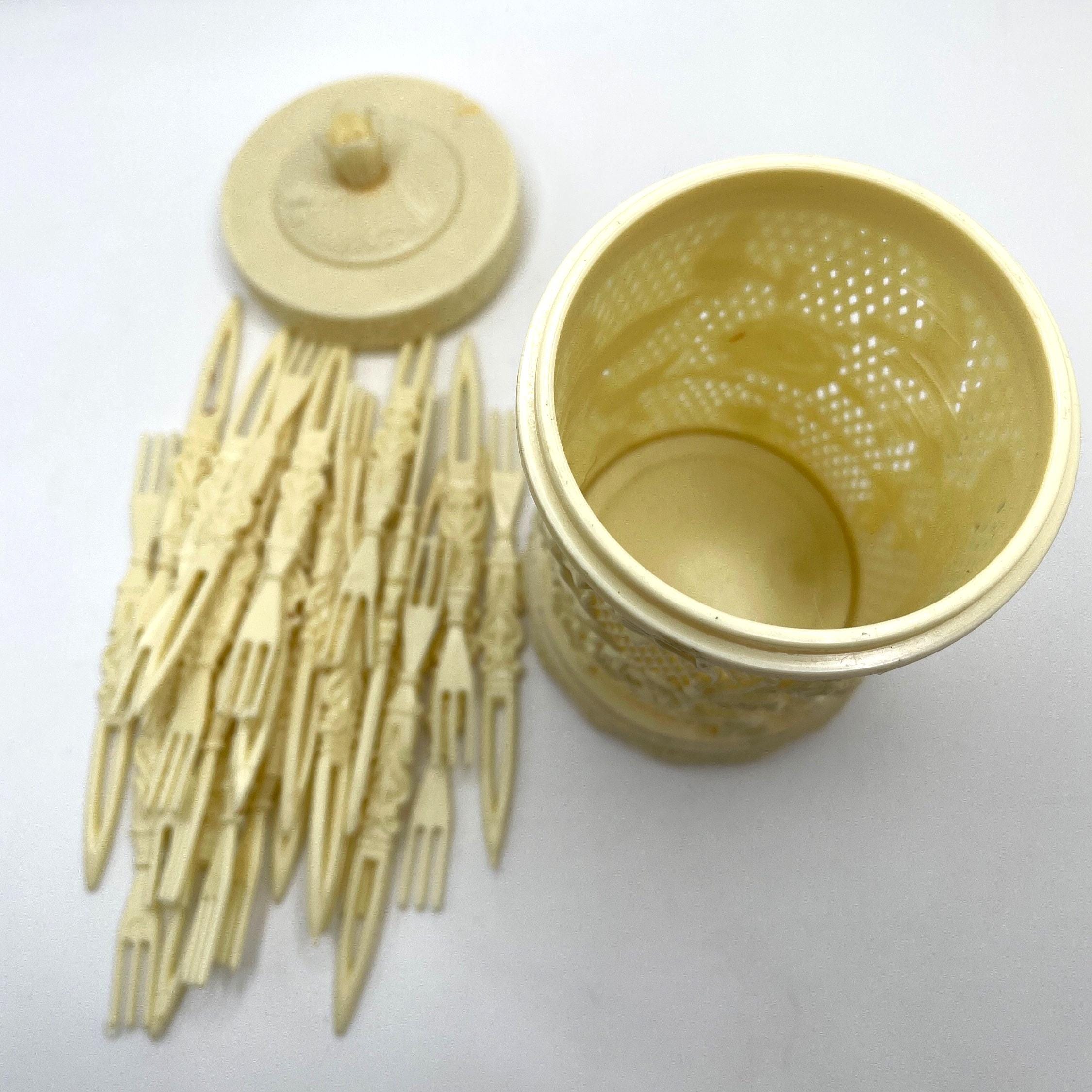 This set includes a beautifully detailed lidded container with raised floral carvings and 23 matching forks designed for appetizers, hors d’oeuvres, or party snacks. Its lightweight celluloid plastic construction reflects the craftsmanship and style of the mid-20th century, making it a great piece for collectors of vintage barware, Asian décor, or retro kitchen accessories.