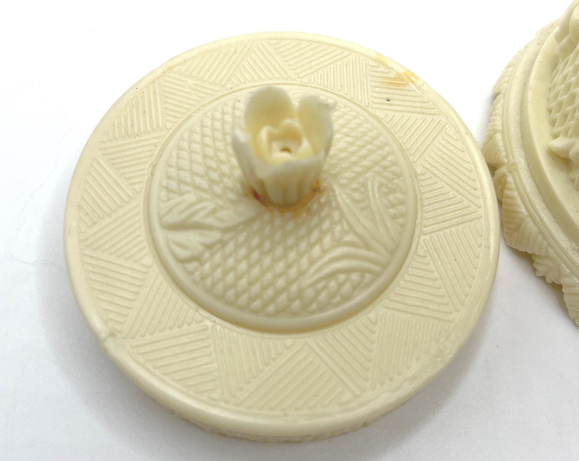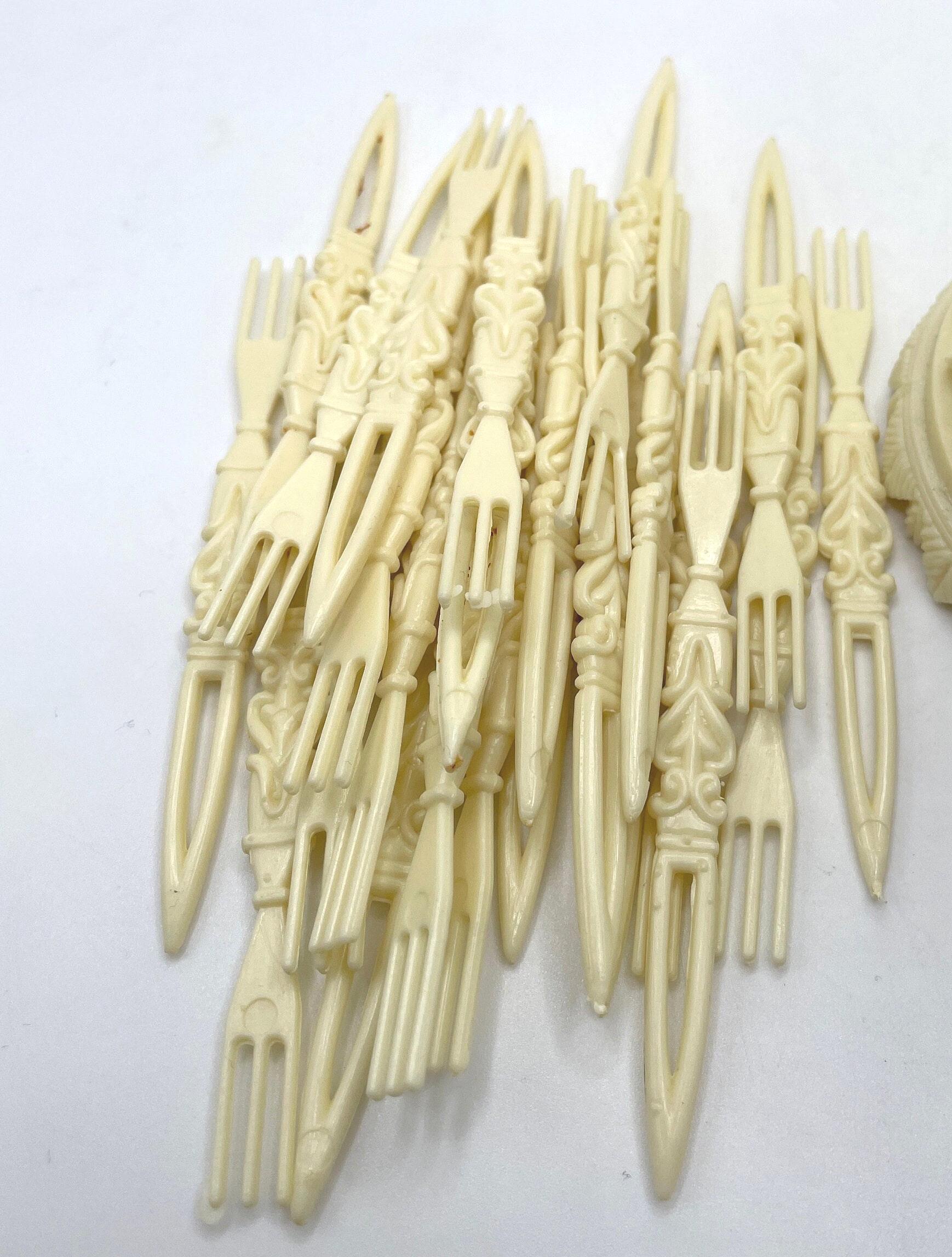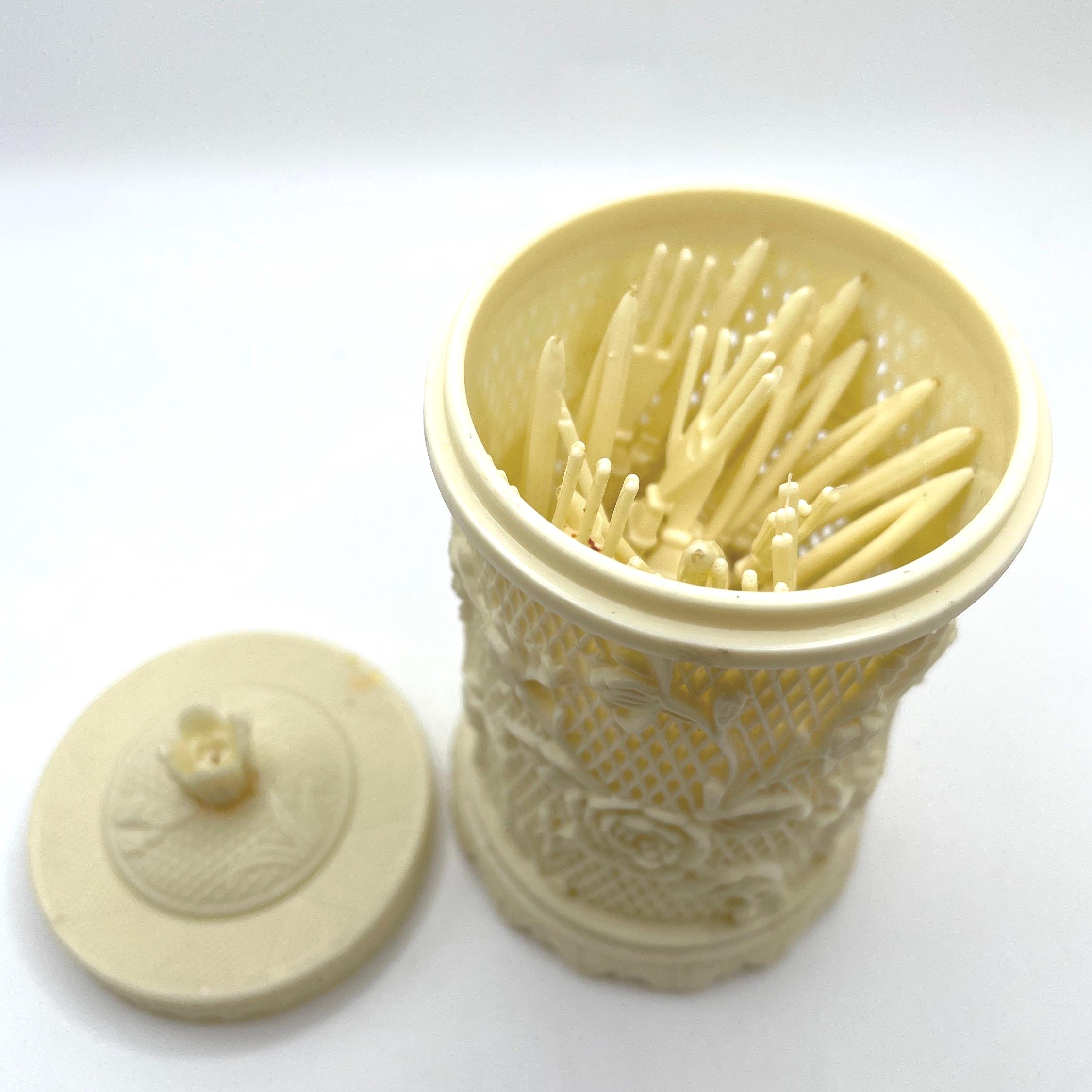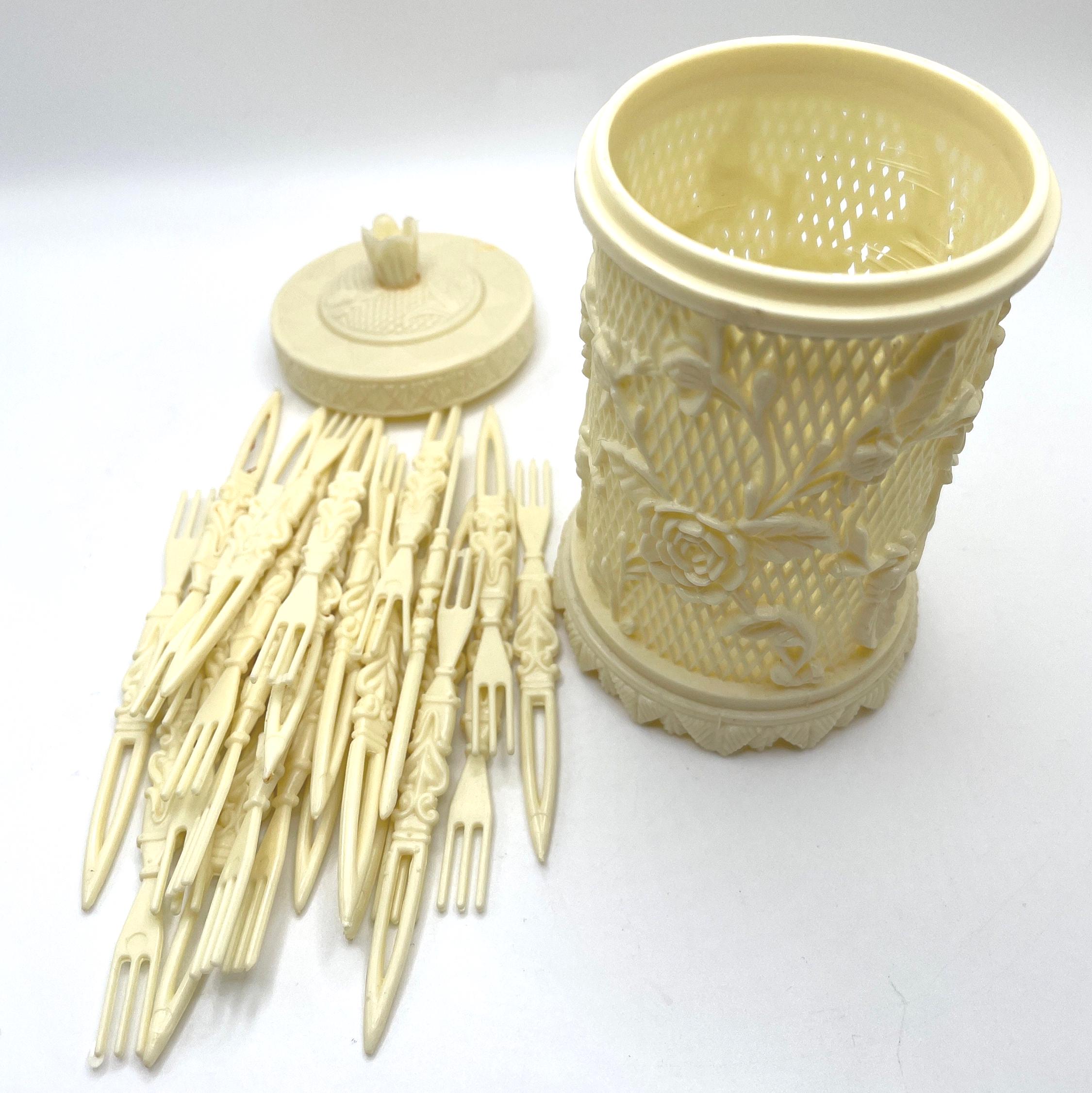 This set includes a beautifully detailed lidded container with raised floral carvings and 23 matching forks designed for appetizers, hors d’oeuvres, or party snacks. Its lightweight celluloid plastic construction reflects the craftsmanship and style of the mid-20th century, making it a great piece for collectors of vintage barware, Asian décor, or retro kitchen accessories.