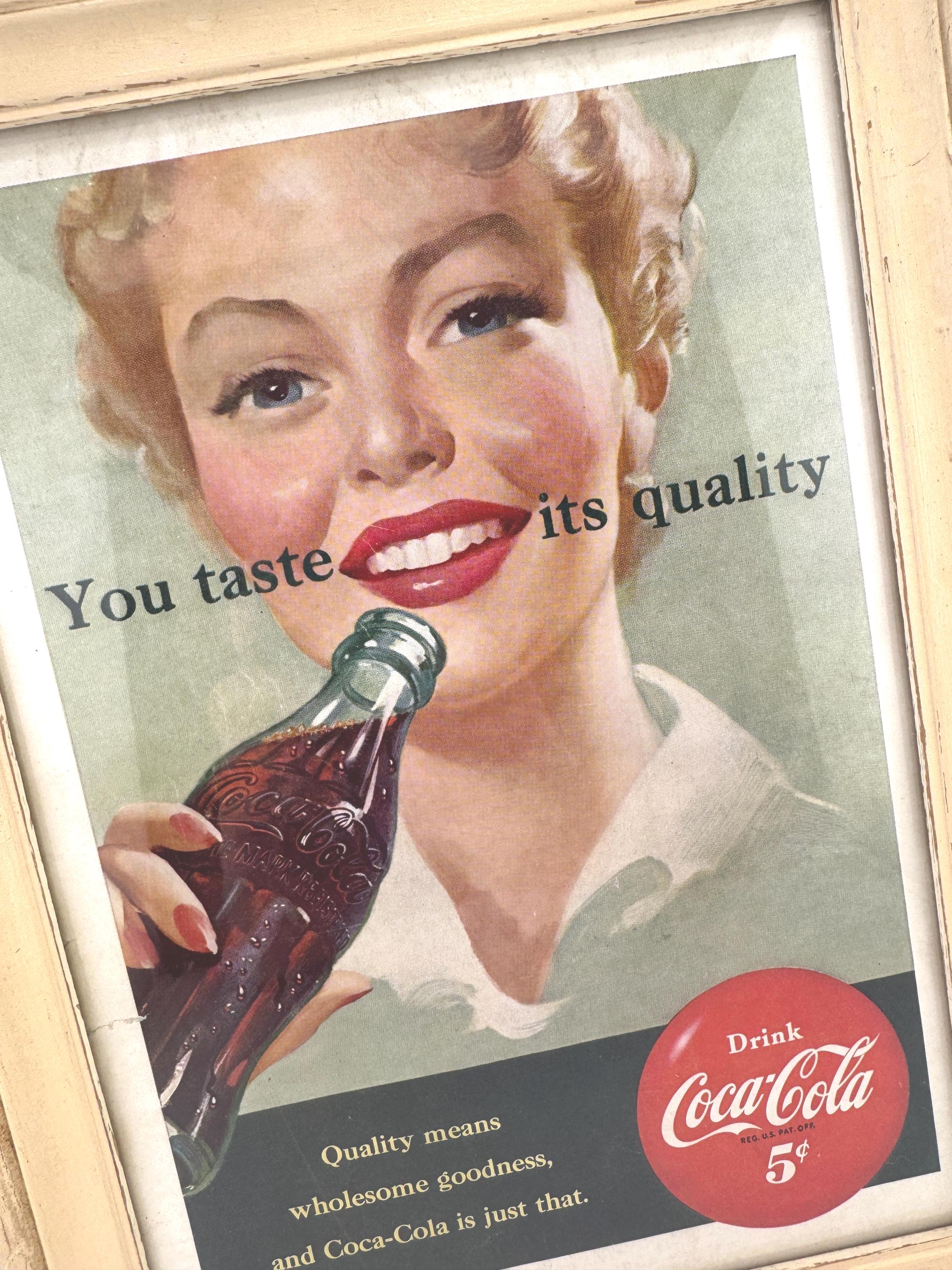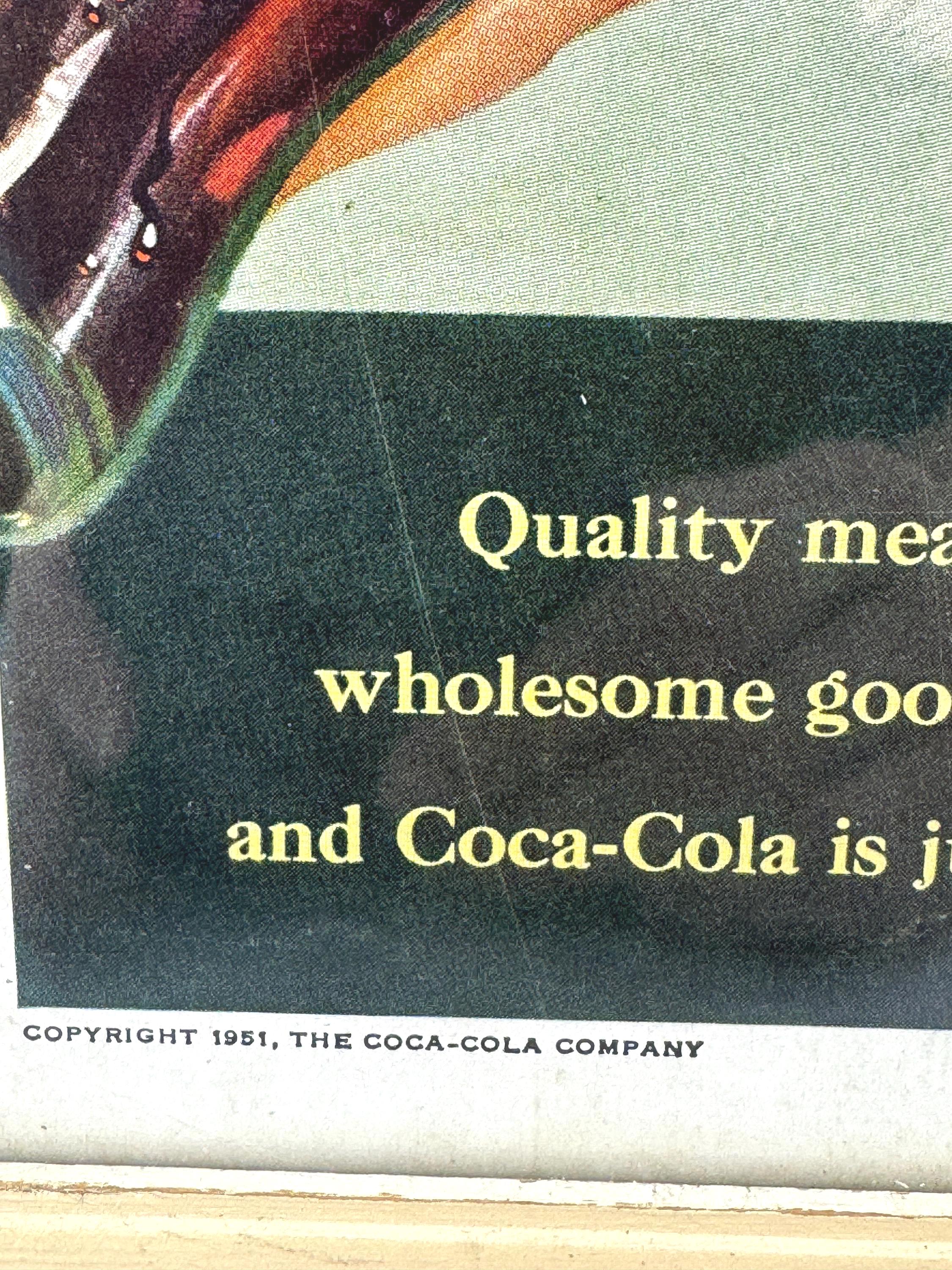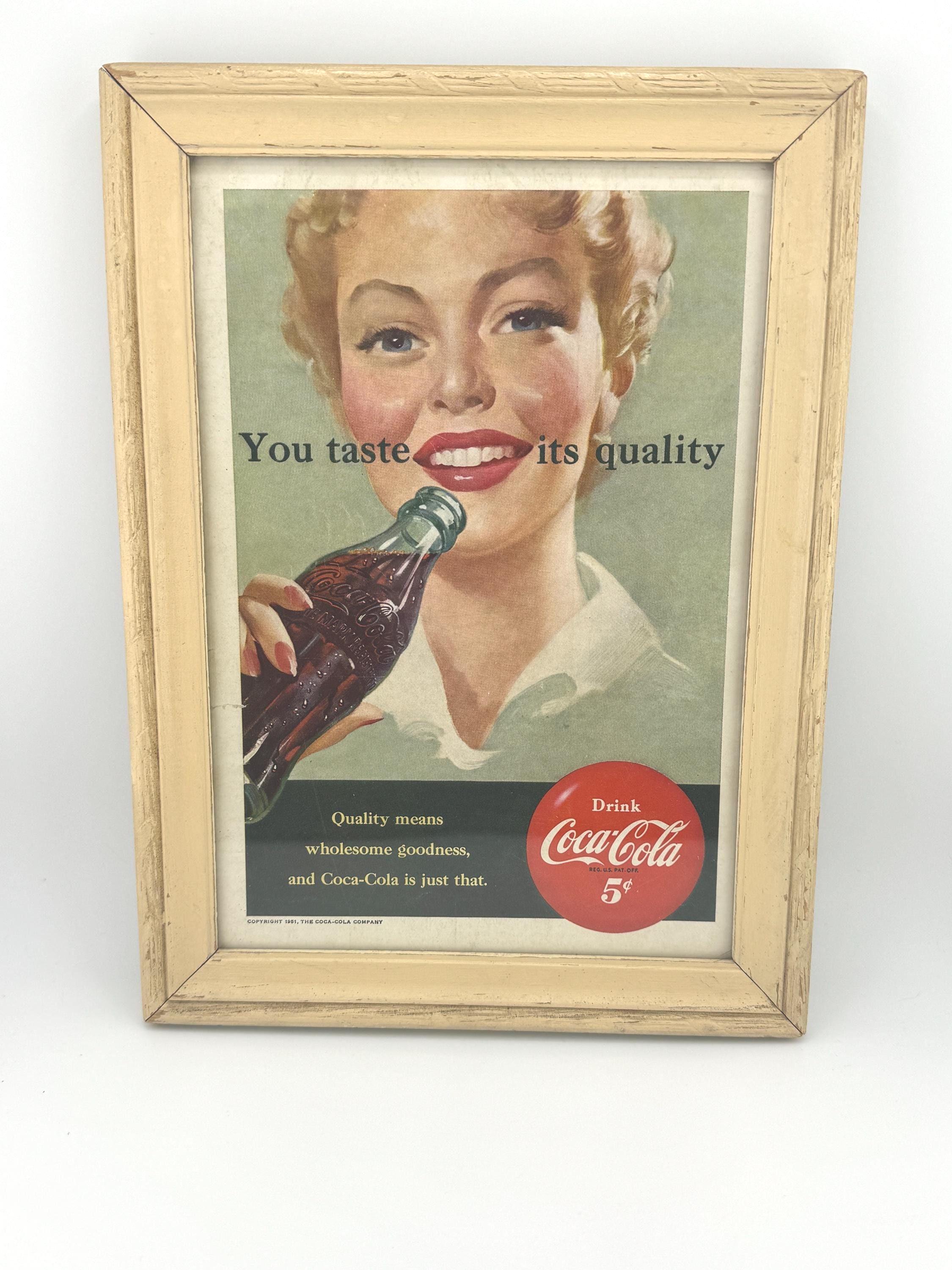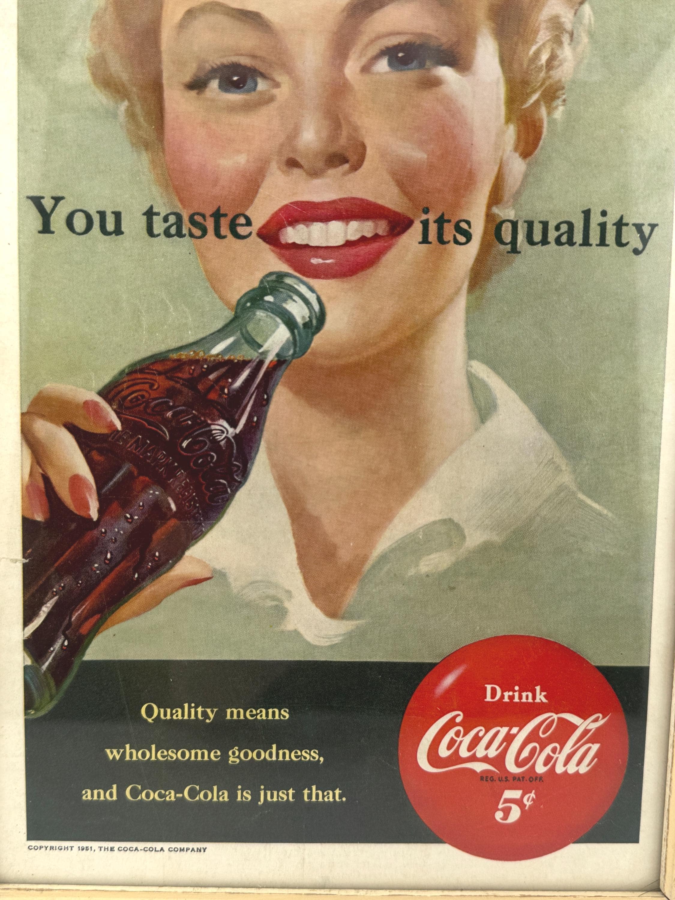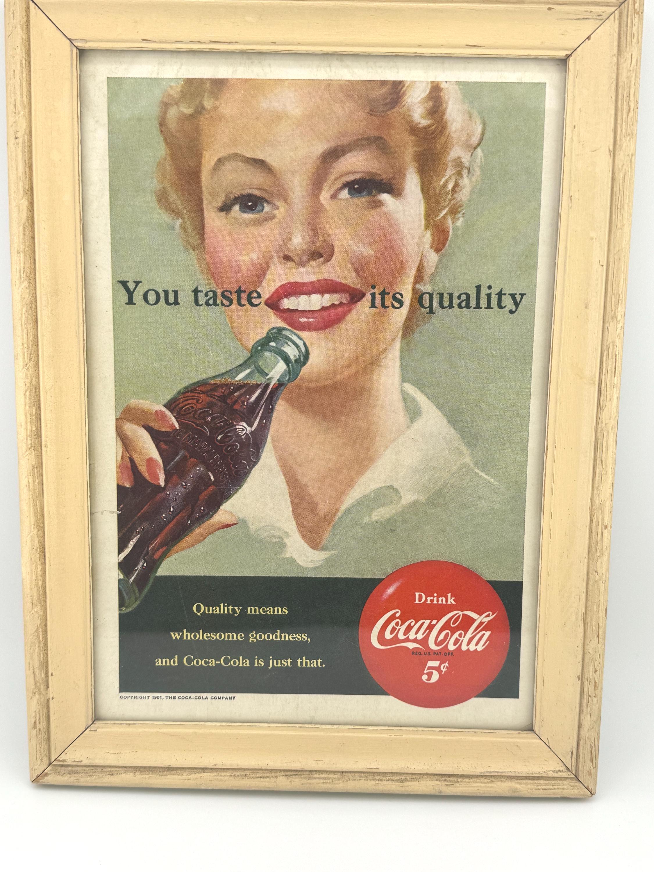 Do you collect Coca-Cola items? This 1951 framed Coca-Cola advertisement is a great item to add to your collection. Ad reads, "You taste its quality", "Quality means wholesome goodness, and Coca-Cola is just that." Displays the red button sign "Drink Coca-Cola Reg. U.S. Pat. Off. 5".