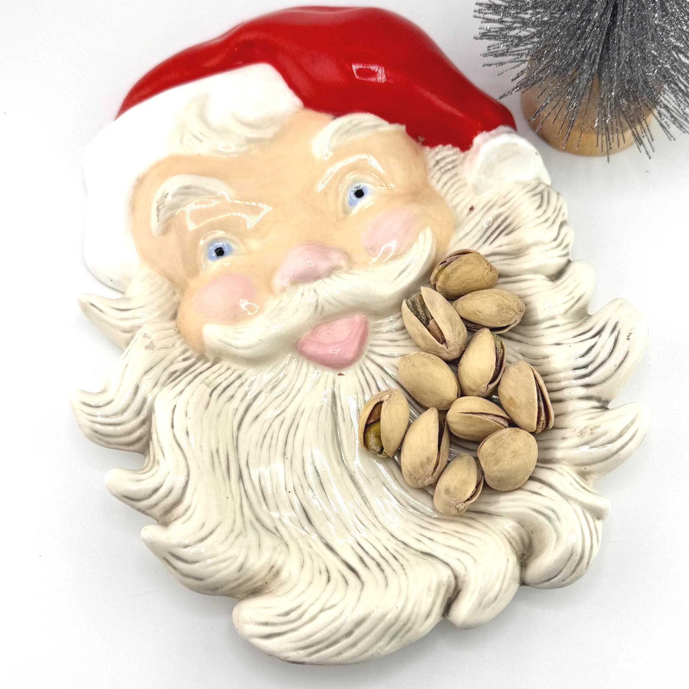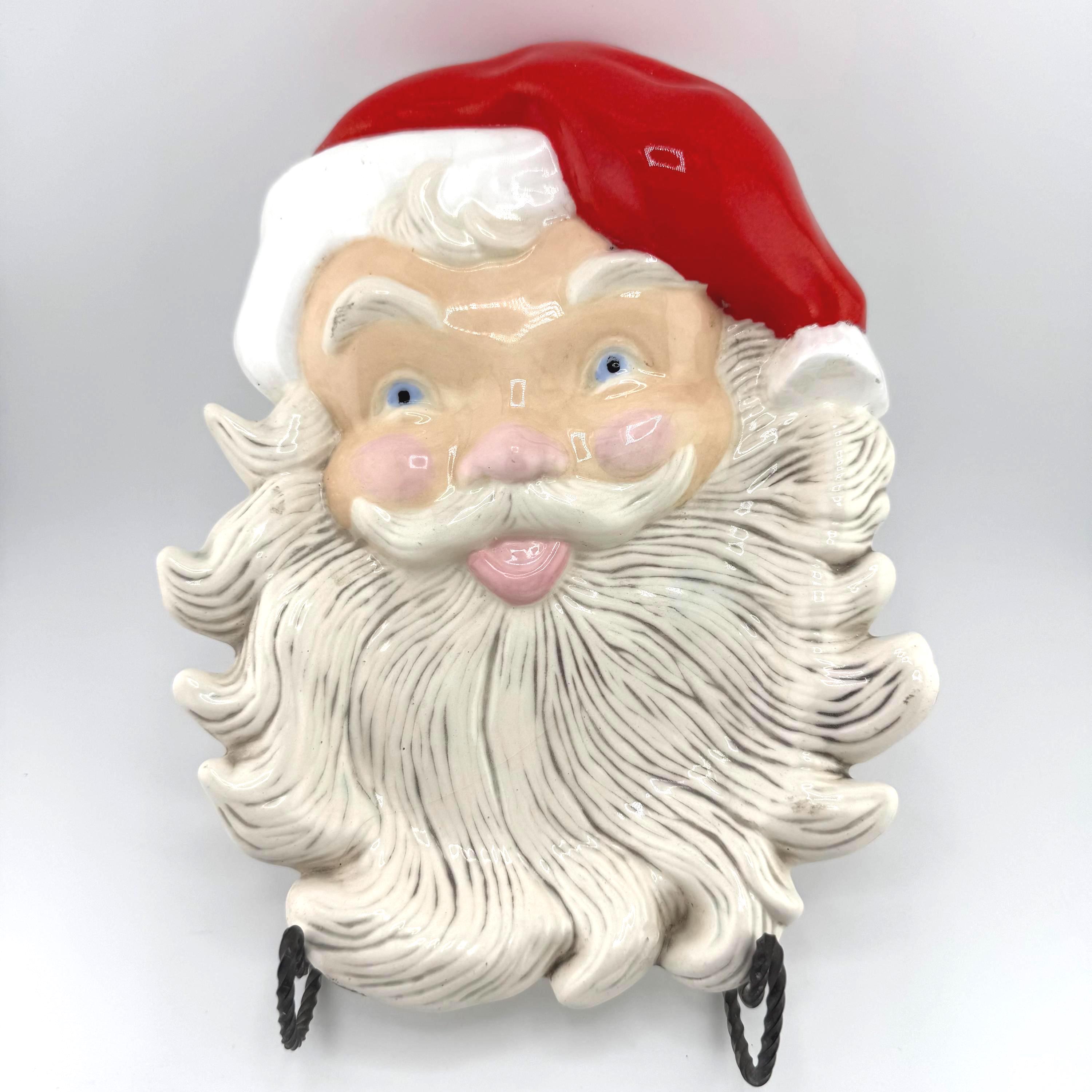 Add a touch of nostalgic holiday cheer with this vintage ceramic Santa Claus face plate. Measuring approximately 8 inches by 6 inches, this charming dish features Santa’s rosy cheeks, flowing white beard, and classic red hat.