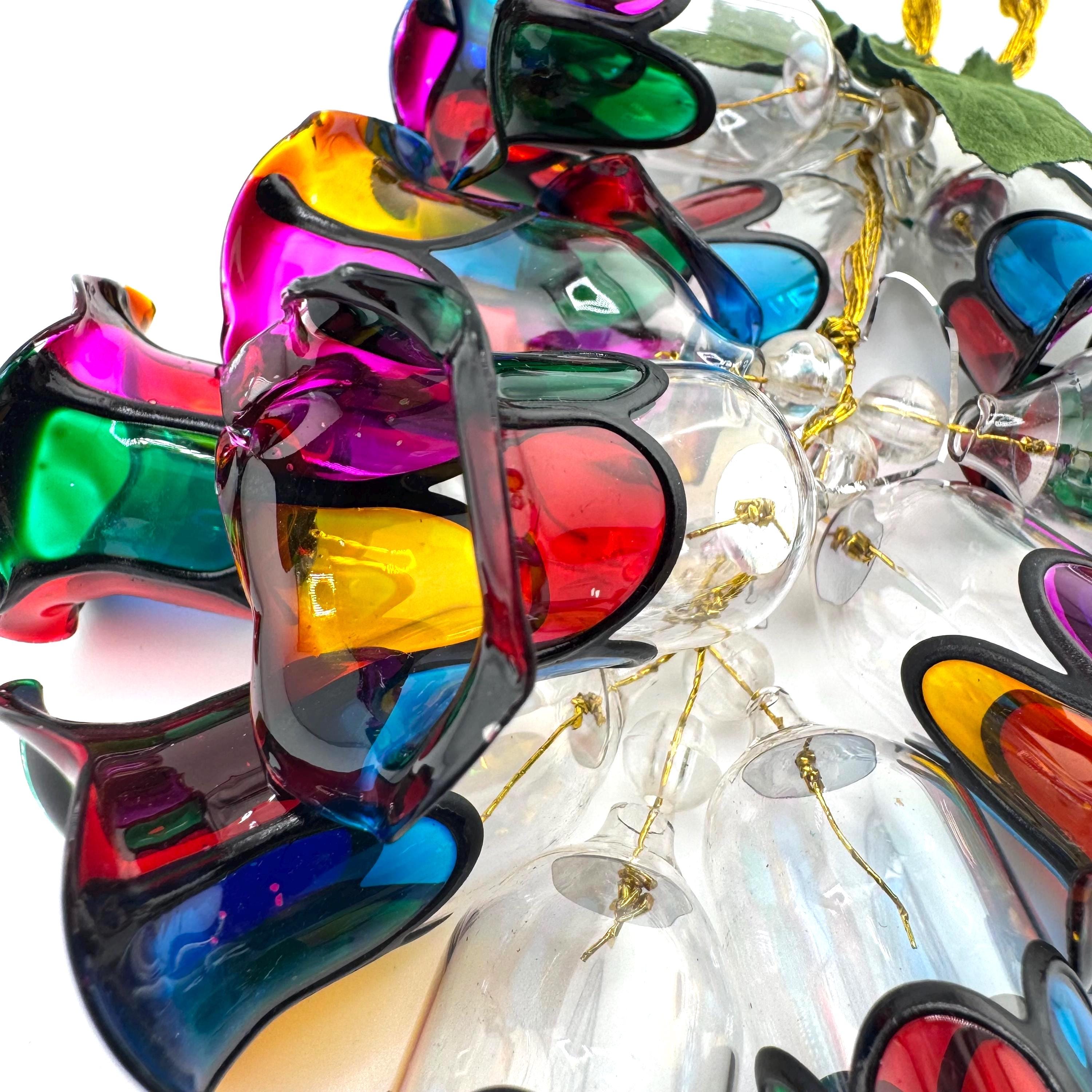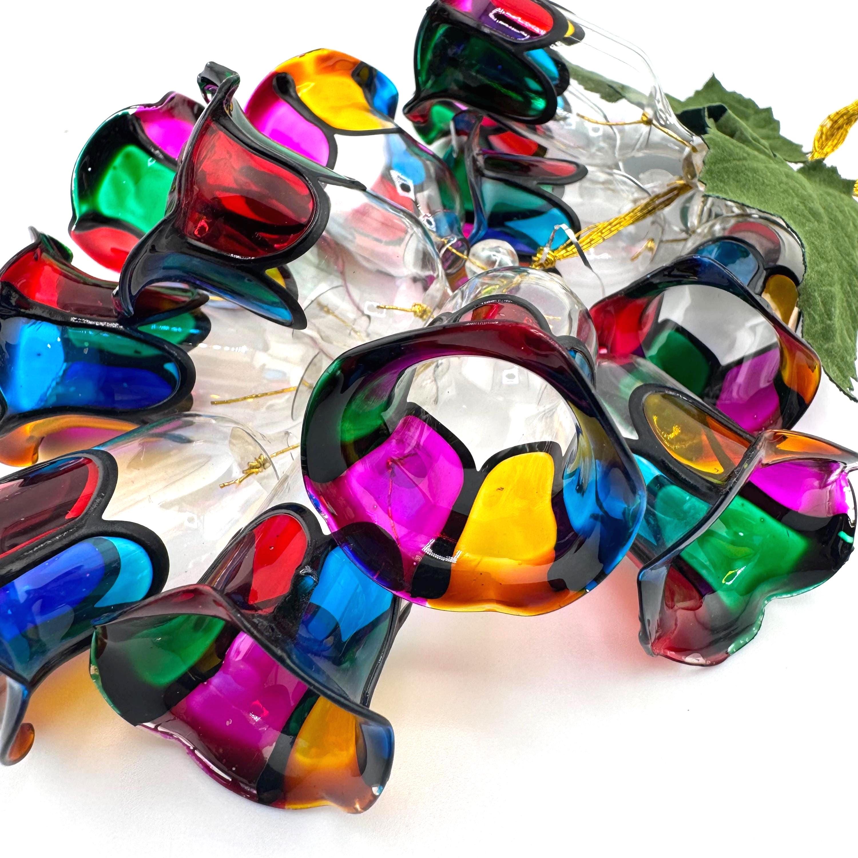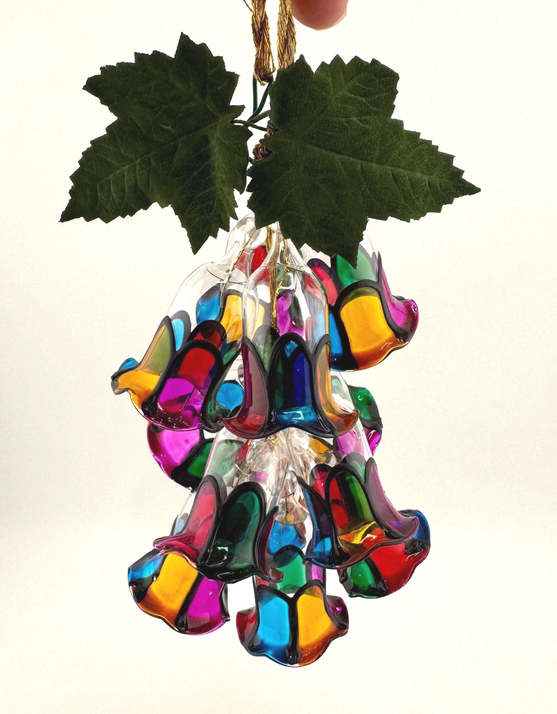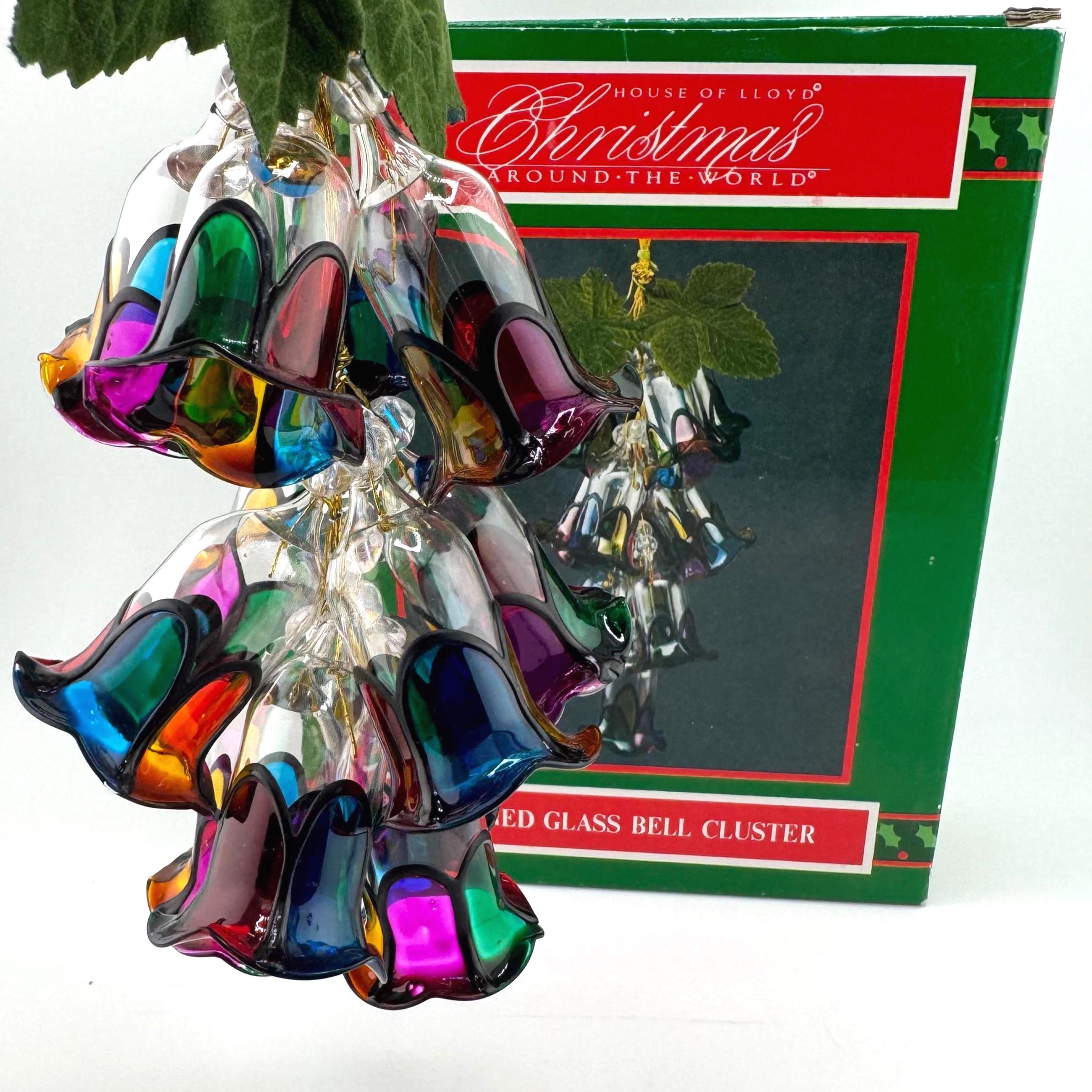 Add a touch of vintage holiday charm with this beautiful stained glass style bell cluster ornament from House of Lloyd’s Christmas Around the World collection. This eye-catching hanging decoration features a cascading cluster of colorful acrylic bells with black trim, finished with a gold hanging cord and green leaves for a festive accent.
