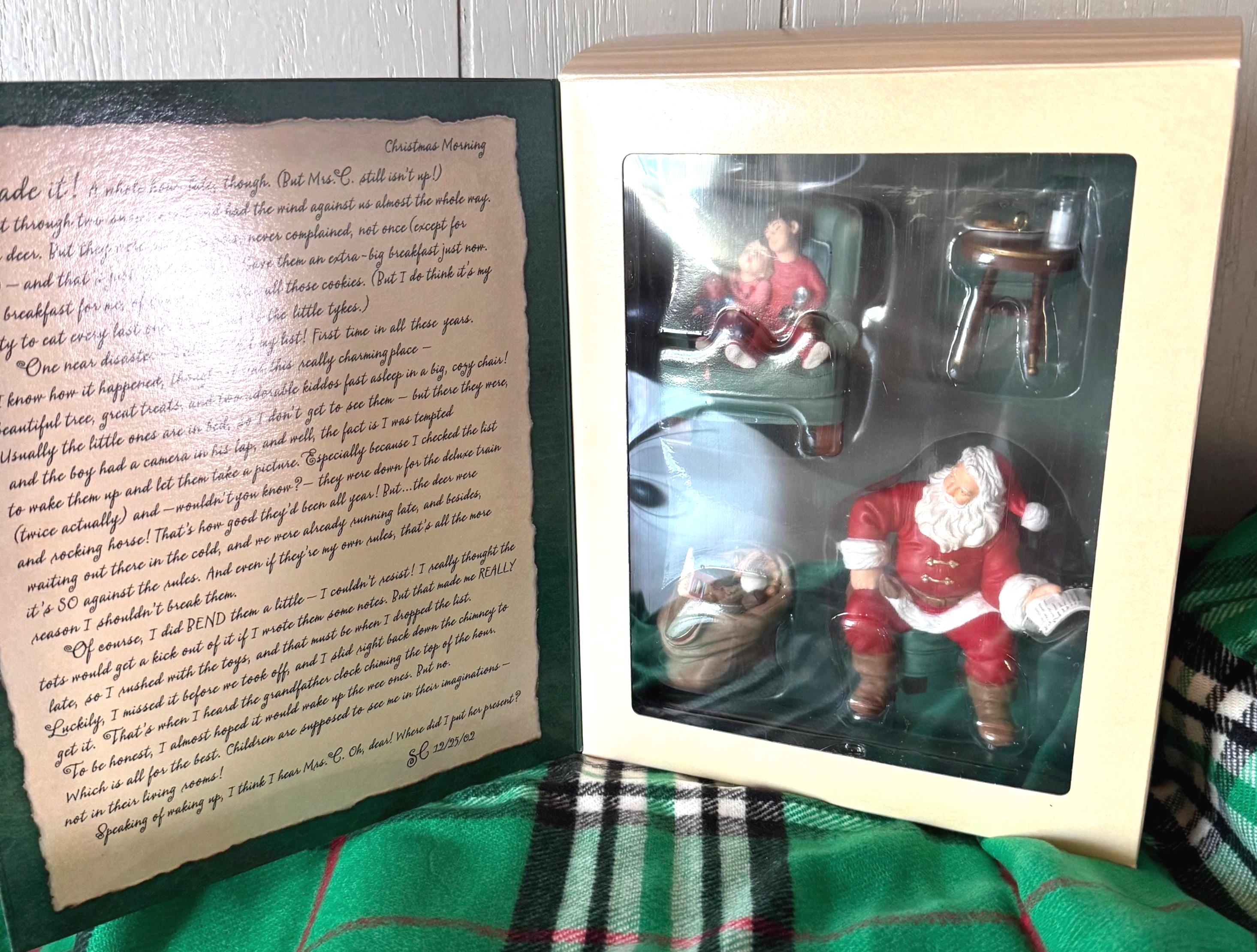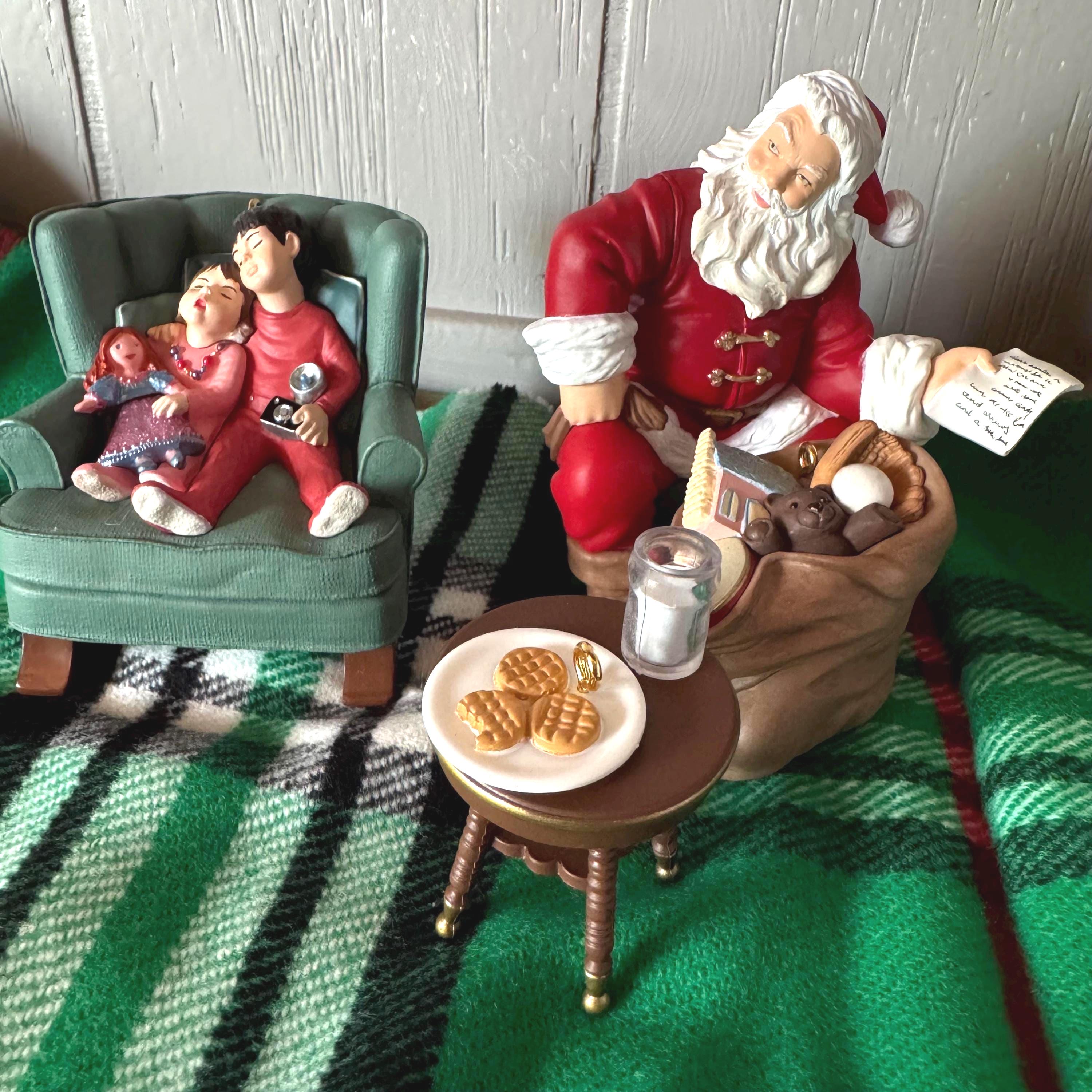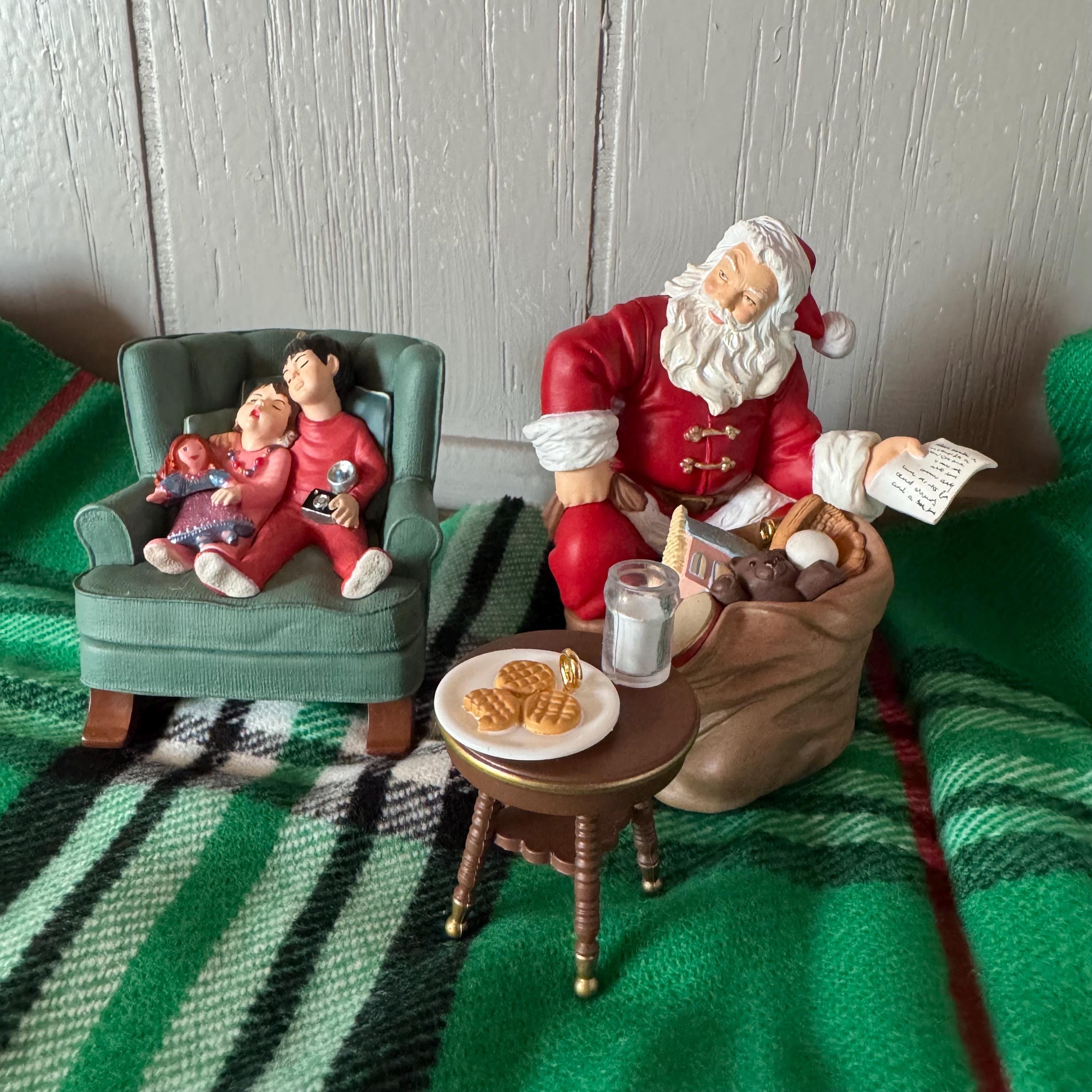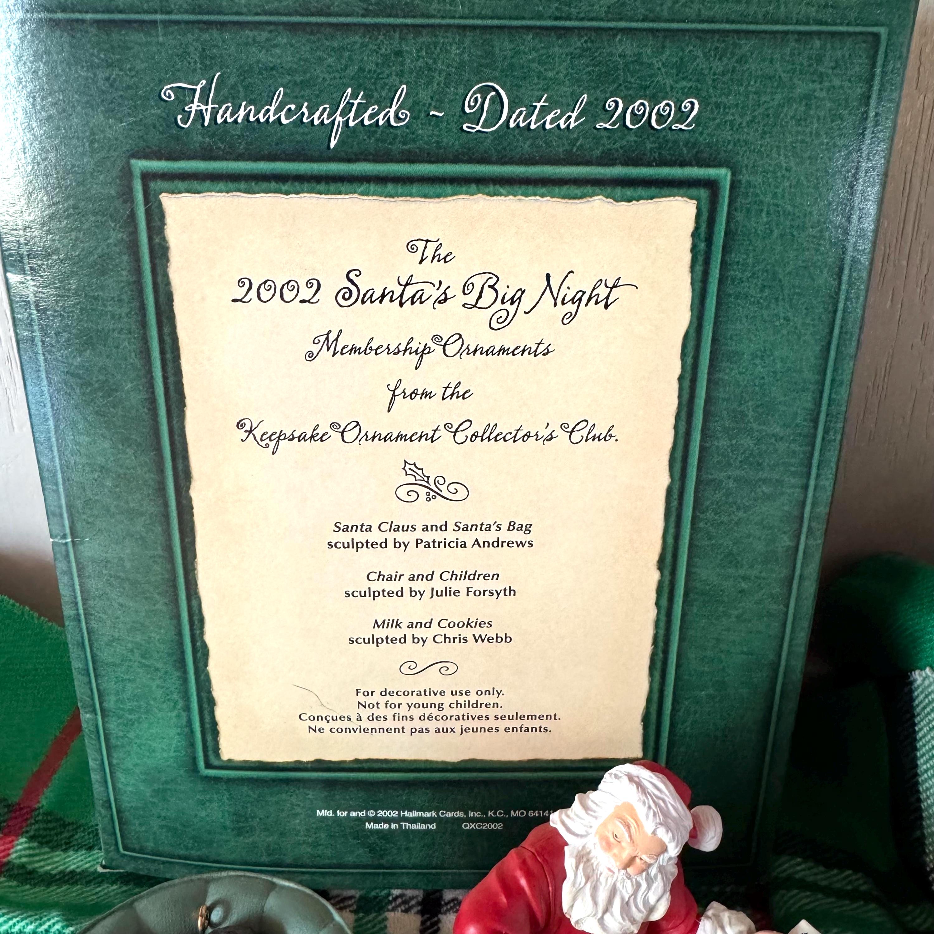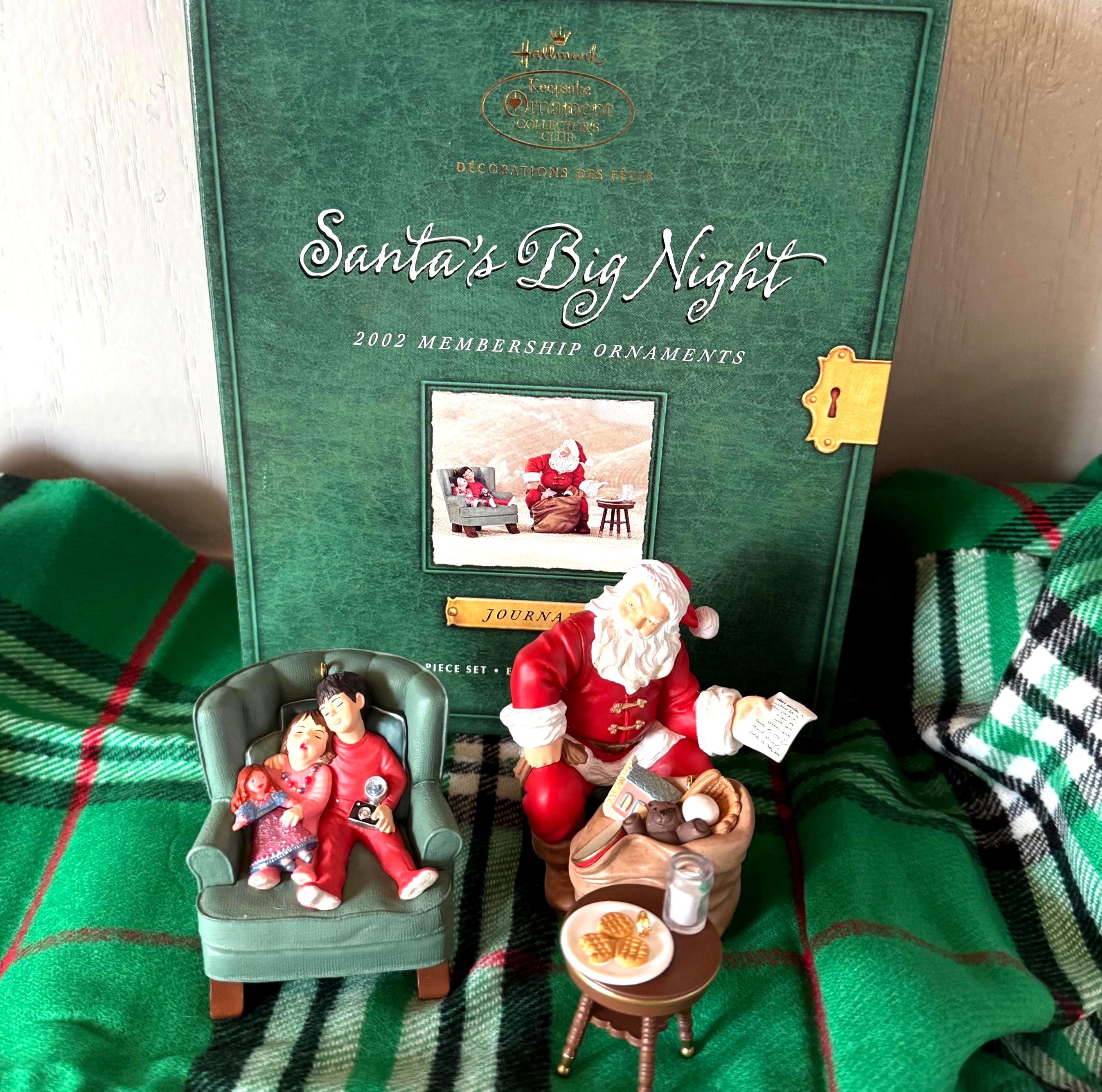 This rare Hallmark Santa’s Big Night ornament set was released in 2002 exclusively for Hallmark Collectors Club members. The set includes a beautifully detailed scene with: