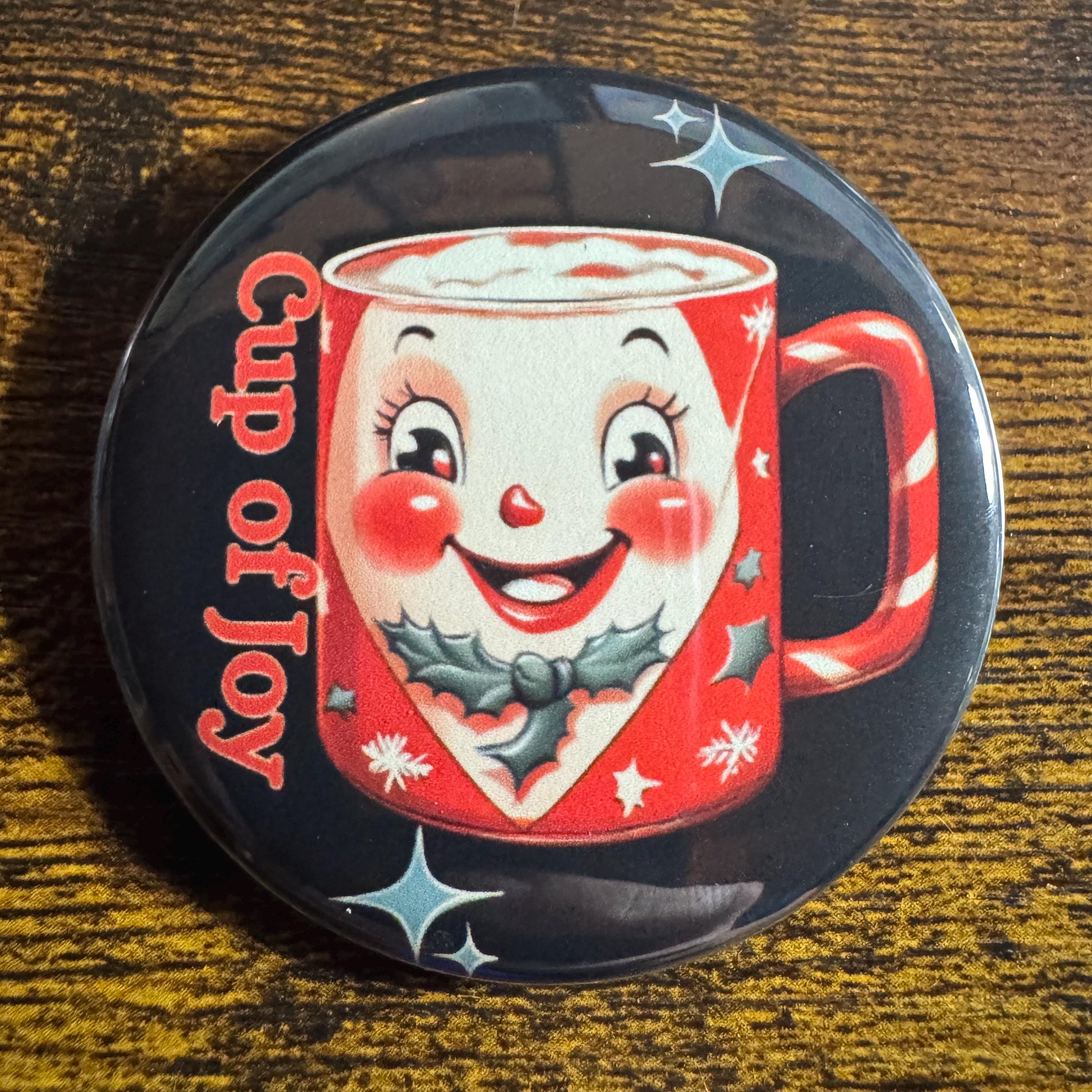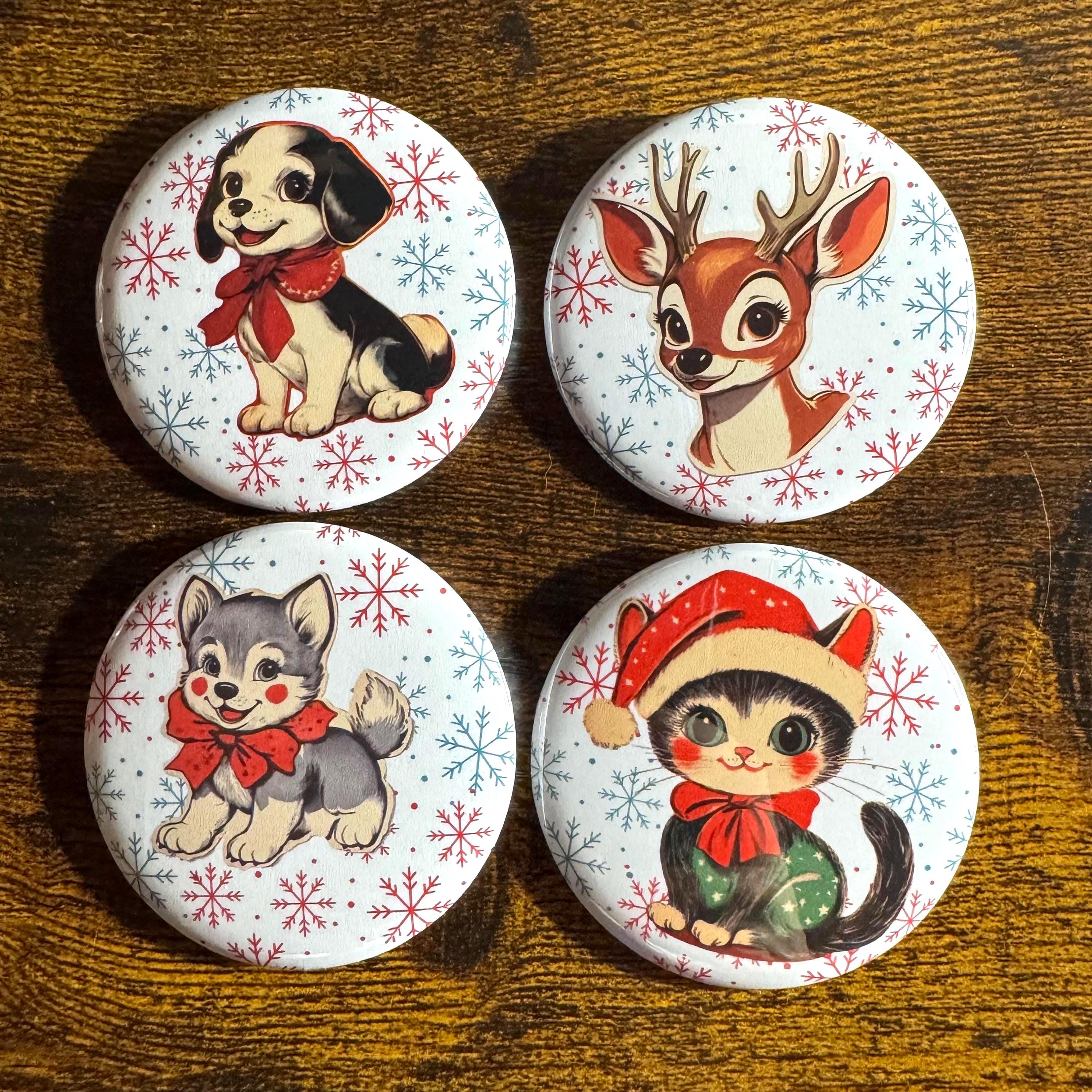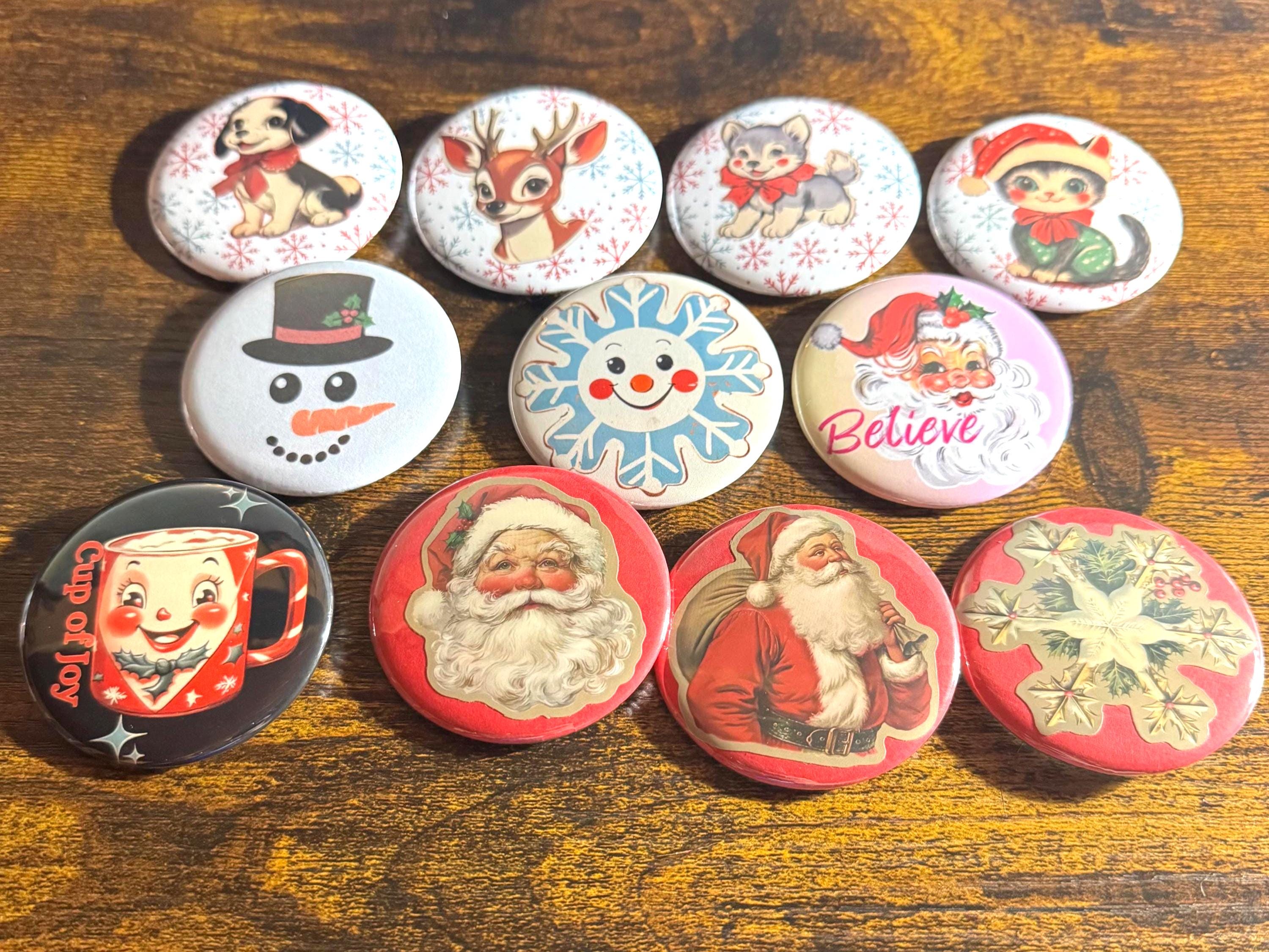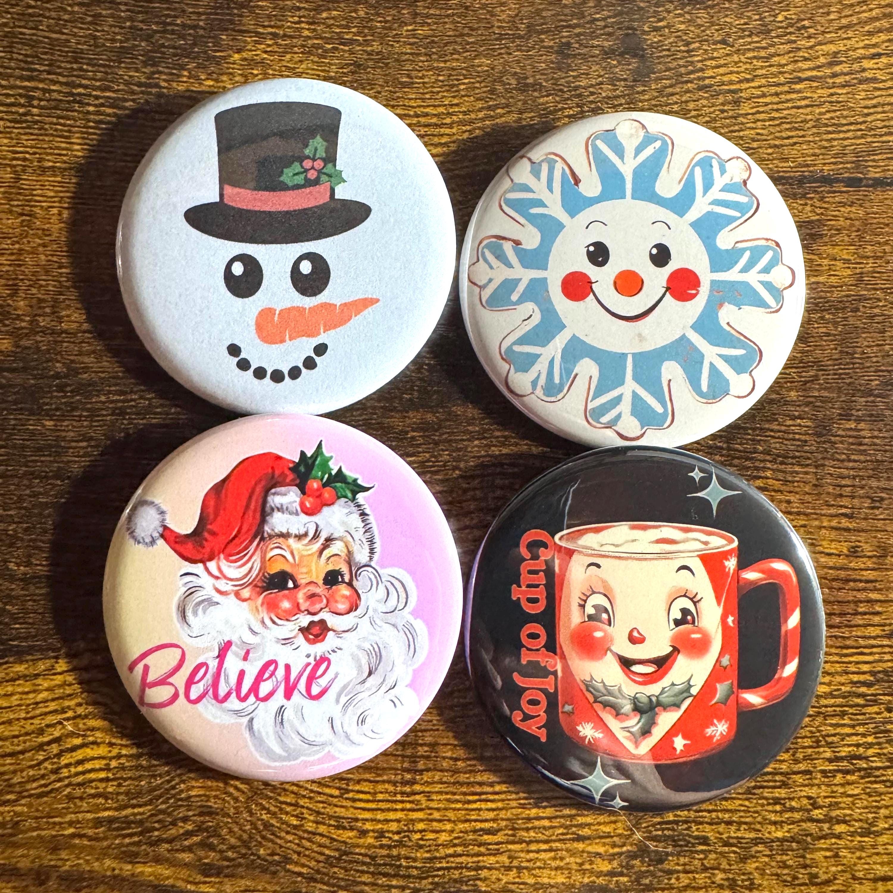 These 2.25-inch pinback buttons, keychains, magnets, mirrors, and bottle openers feature retro-inspired holiday designs that capture the fun, nostalgia, and magic of the season. Perfect for spreading cheer or adding a festive touch to your bag, fridge, jacket, or vanity!