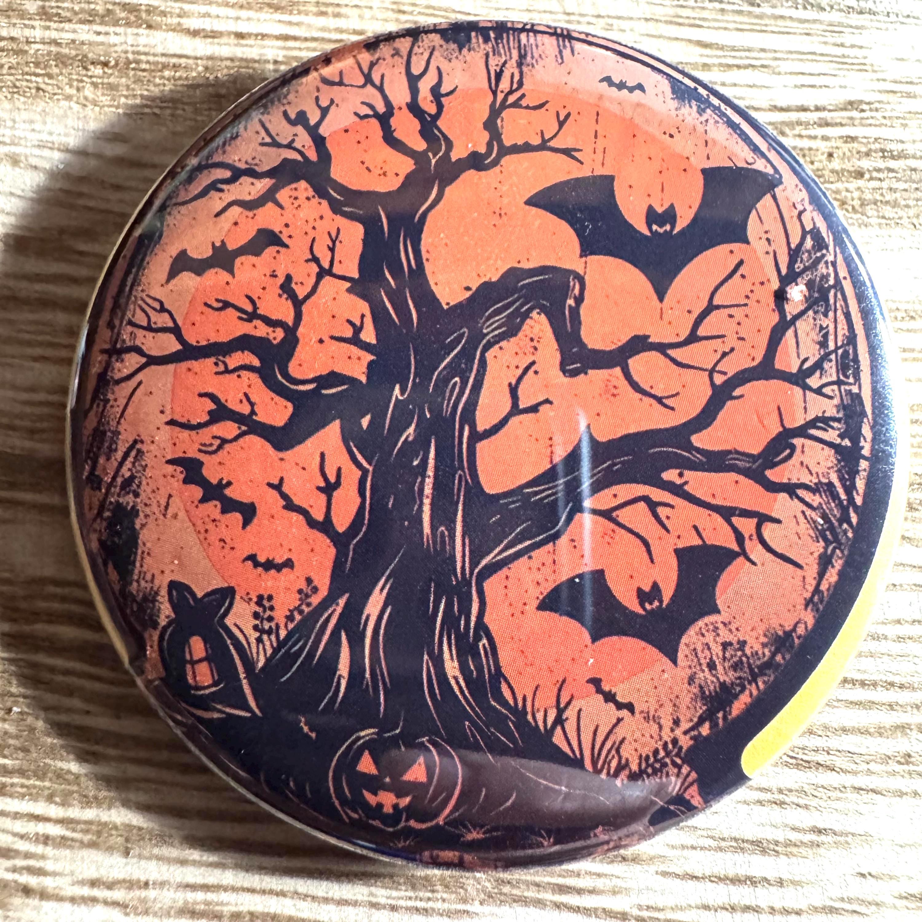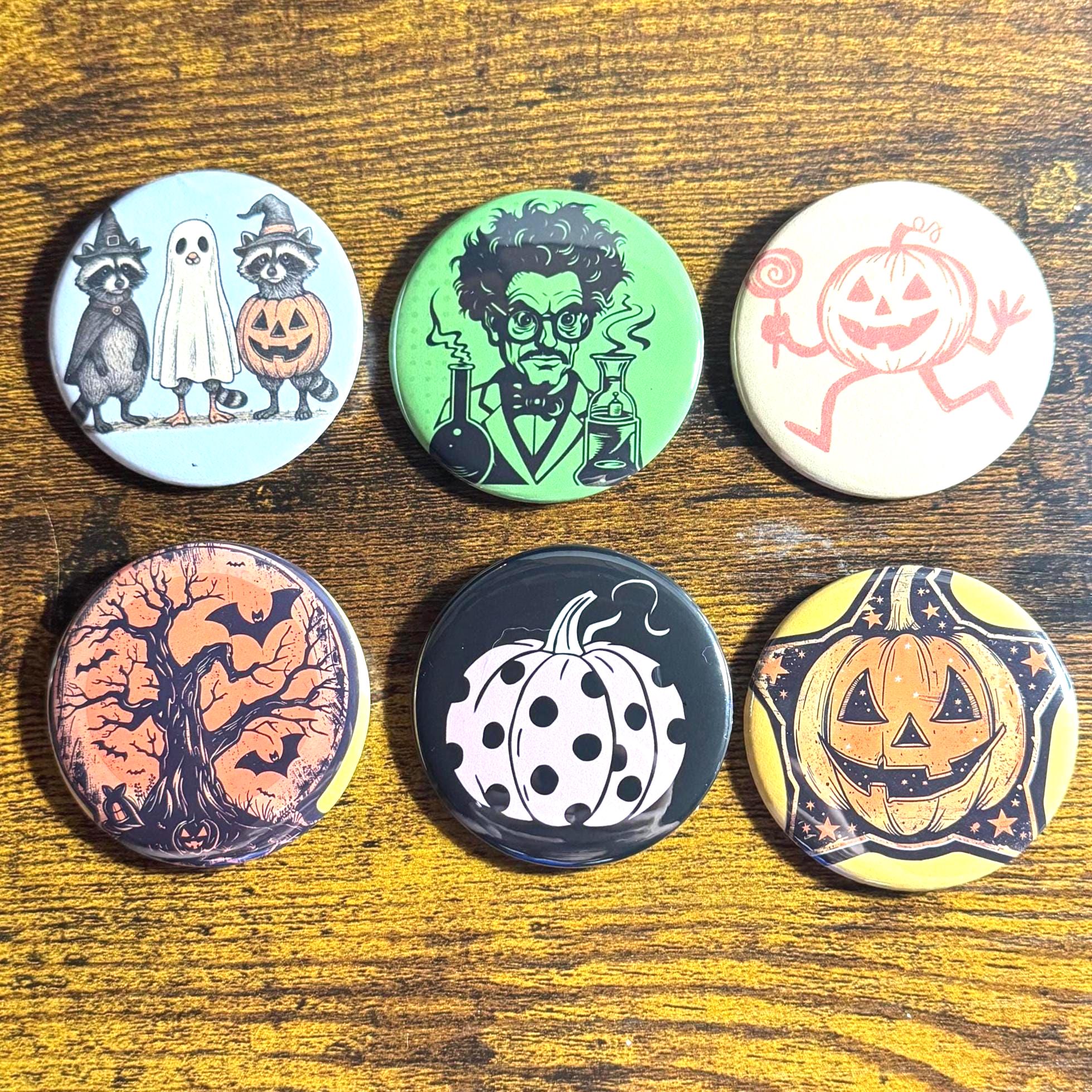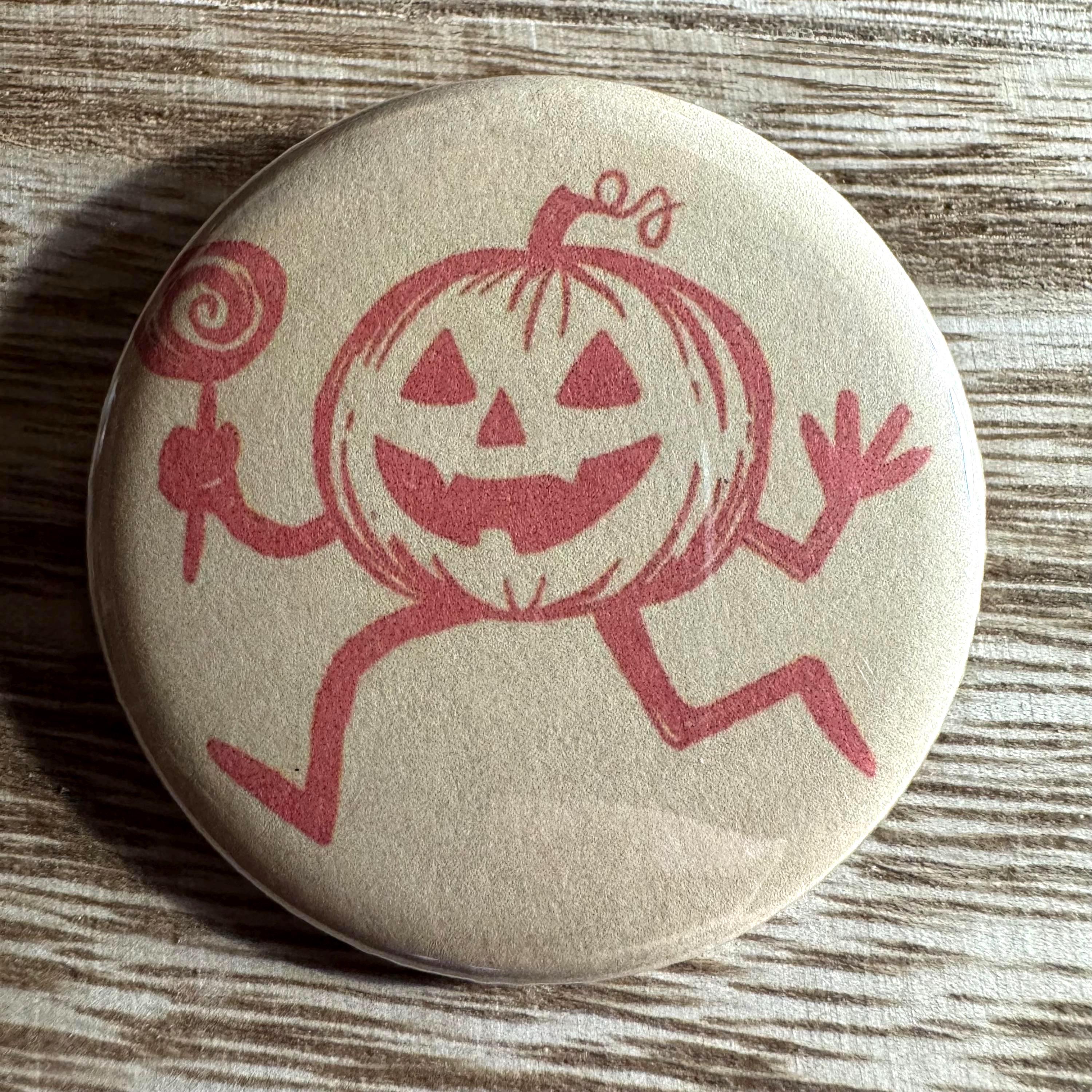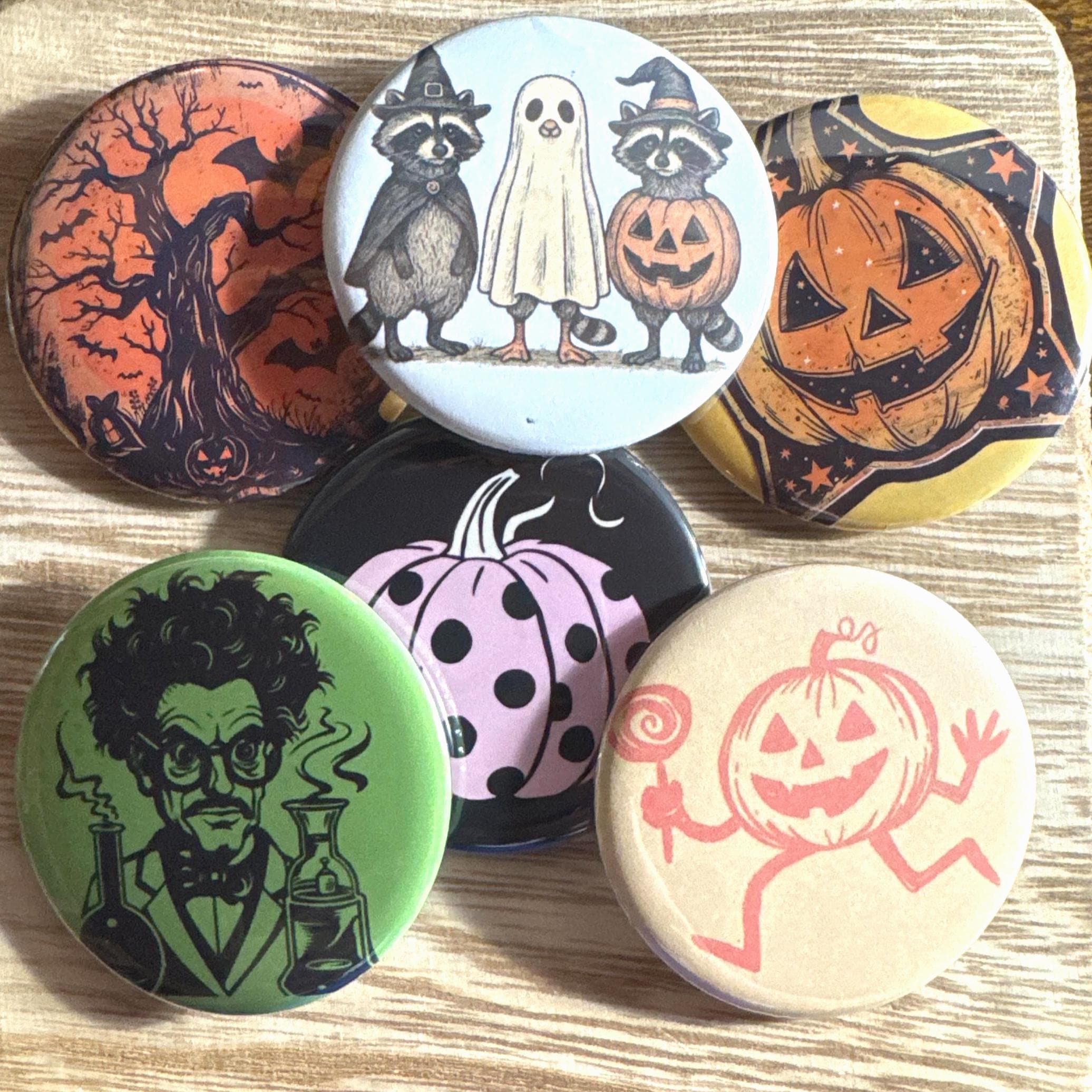 These 2.25-inch pinback buttons, keychains, magnets, mirrors, and bottle openers feature retro Halloween artwork inspired by the 1950s–1970s vintage style—think smiling pumpkins, black cats, classic witches, and old-school trick-or-treat charm!