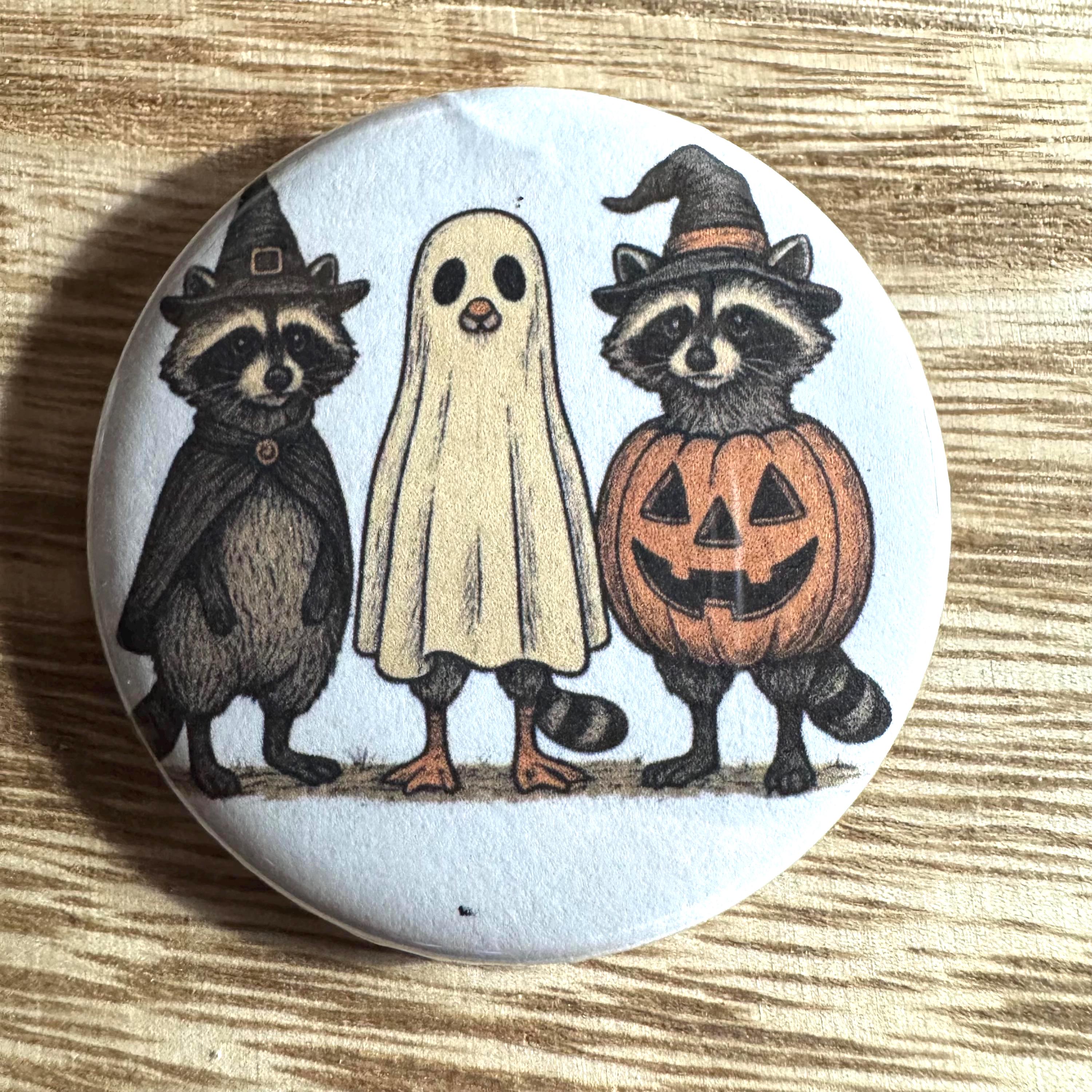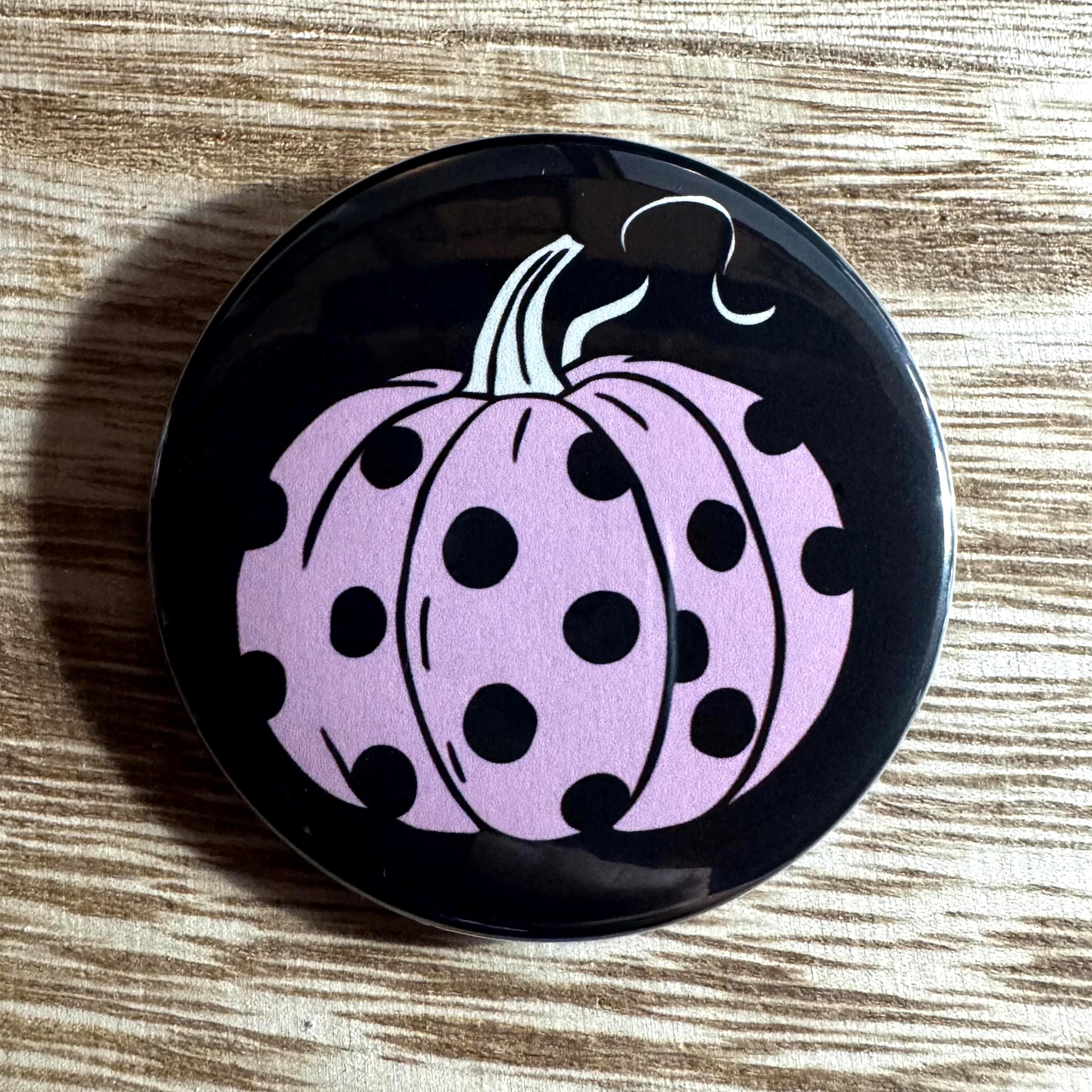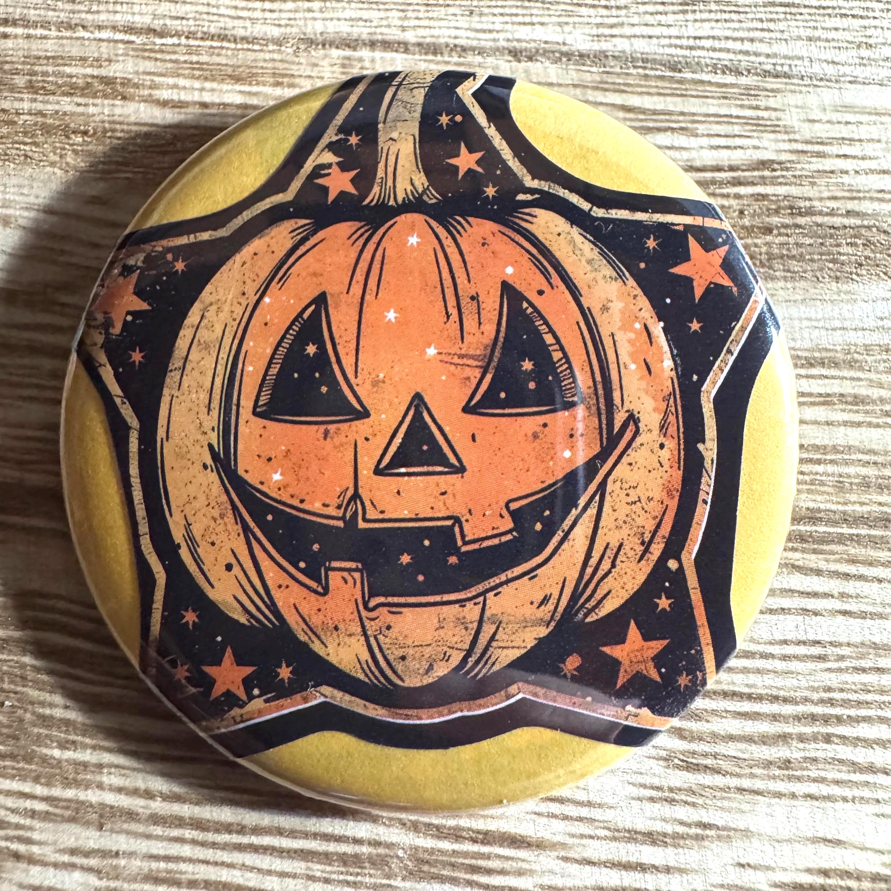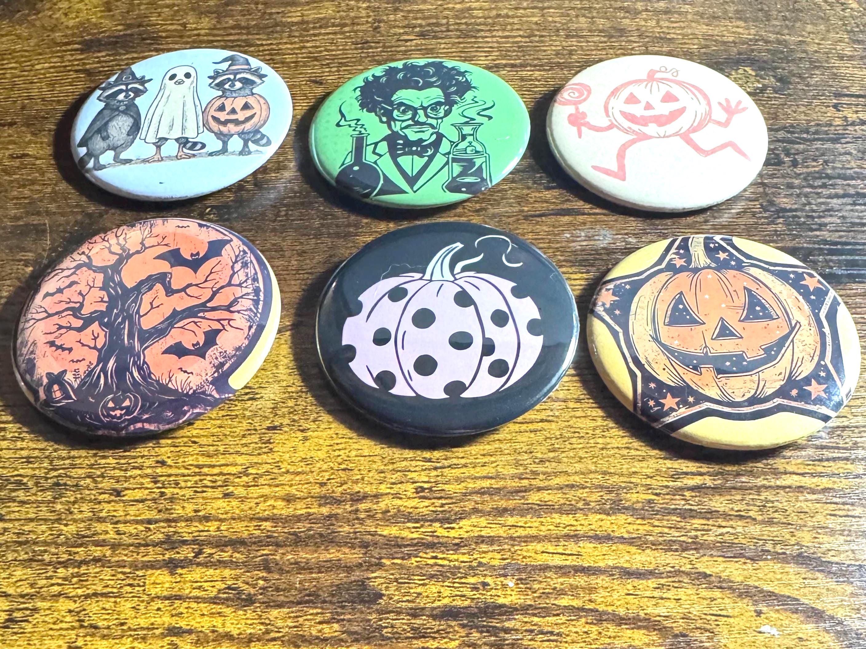 These 2.25-inch pinback buttons, keychains, magnets, mirrors, and bottle openers feature retro Halloween artwork inspired by the 1950s–1970s vintage style—think smiling pumpkins, black cats, classic witches, and old-school trick-or-treat charm!