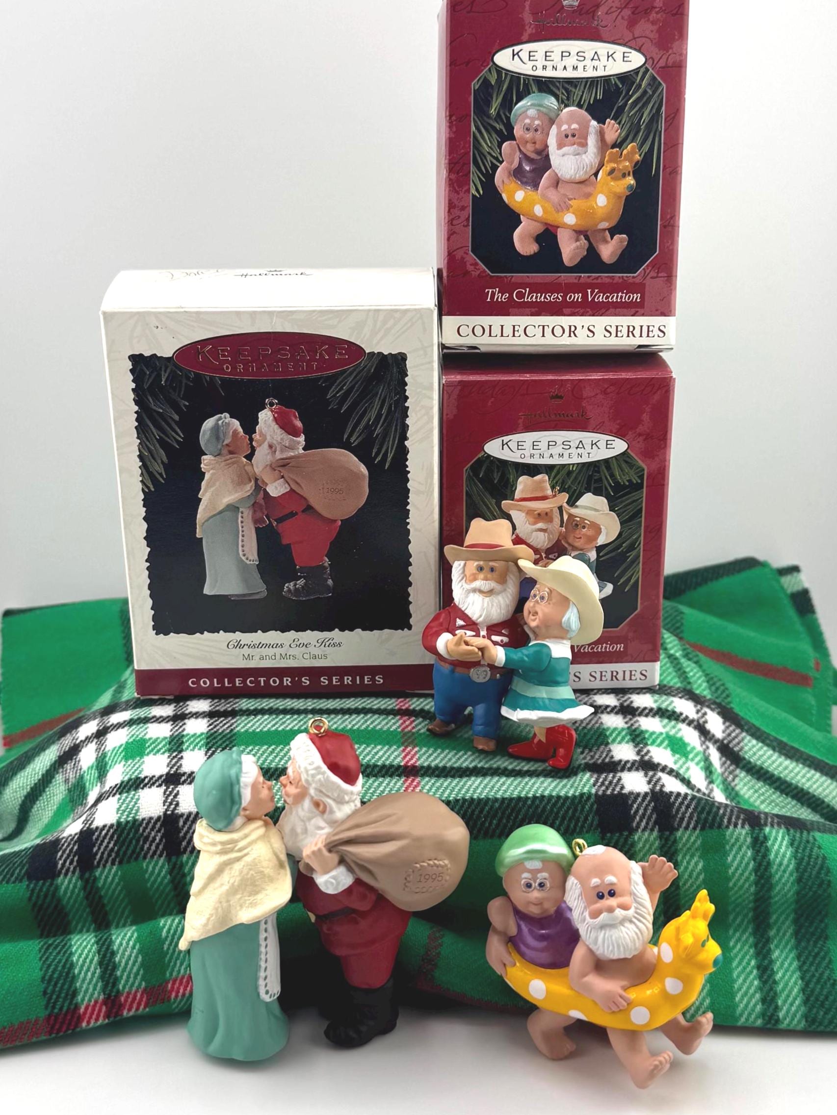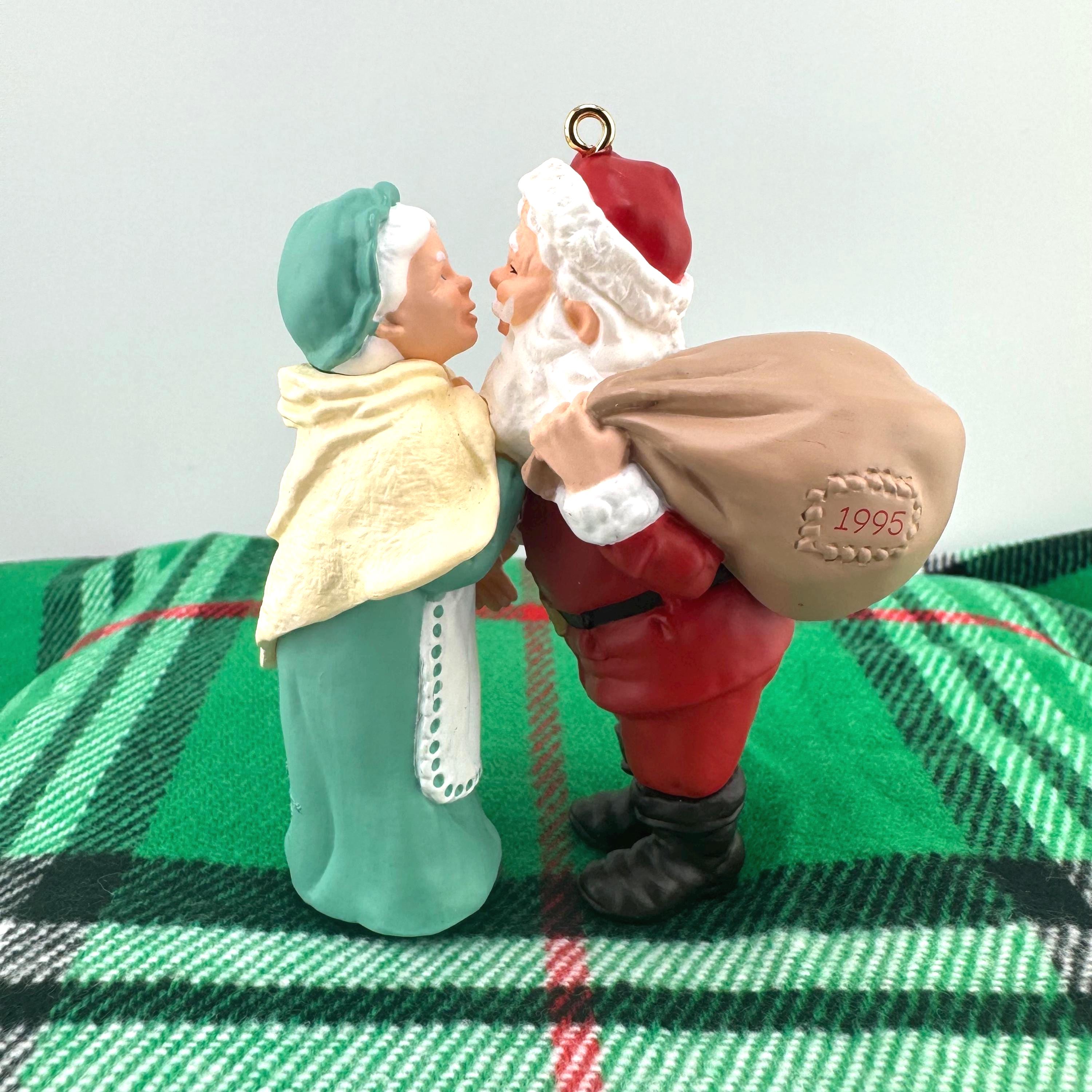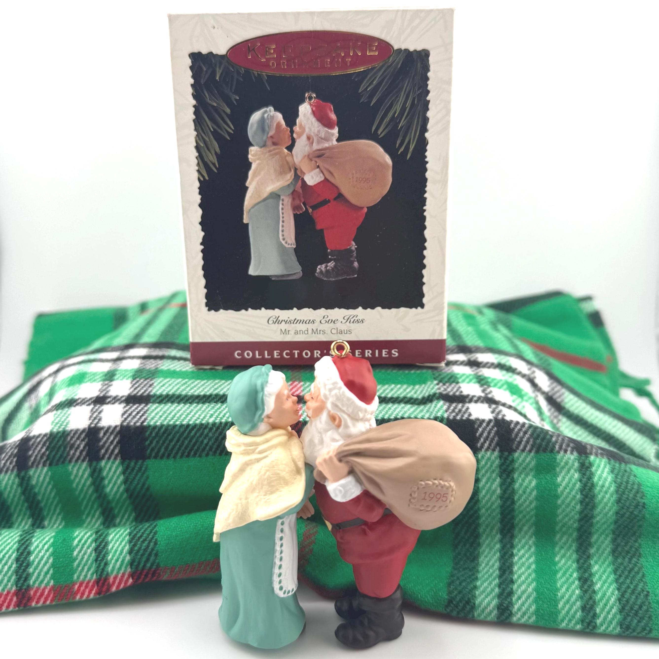 - 1995 “Christmas Eve Kiss” – a heartwarming ornament showing Mr. and Mrs. Claus sharing a sweet holiday moment before Santa’s big night.